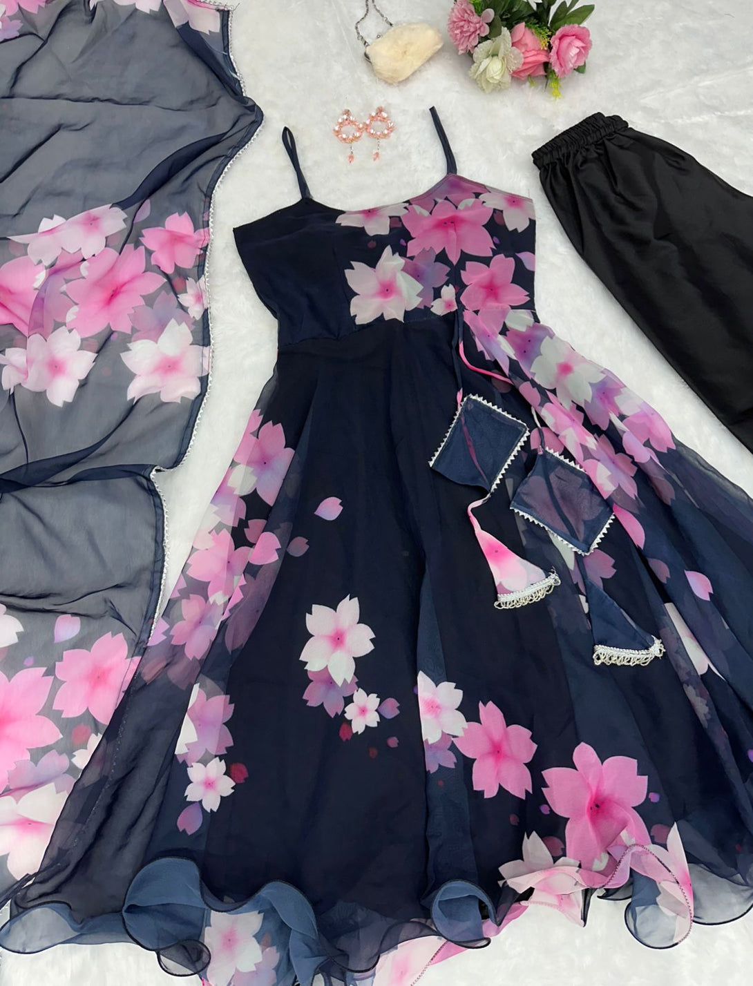 Introducing our Anarkali Floral Print Pure Georgette Fabric Suit! This exquisite ensemble is adorned with tassels on the front detailing, featuring a dori closure for added allure. The suite boasts a voluminous flair, an uneven hemline, and elegant spaghetti straps, creating a captivating and stylish look. Complete the ensemble with a matching dupatta that showcases delicate lace detailing, adding an extra touch of sophistication. Elevate your wardrobe with the timeless charm of our Anarkali Floral Print Pure Georgette Fabric Suit!