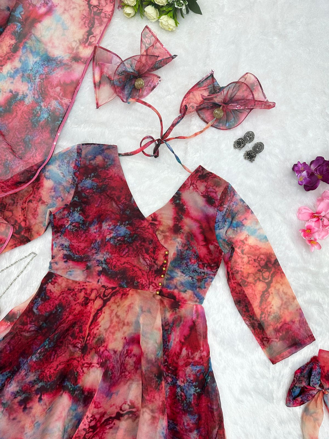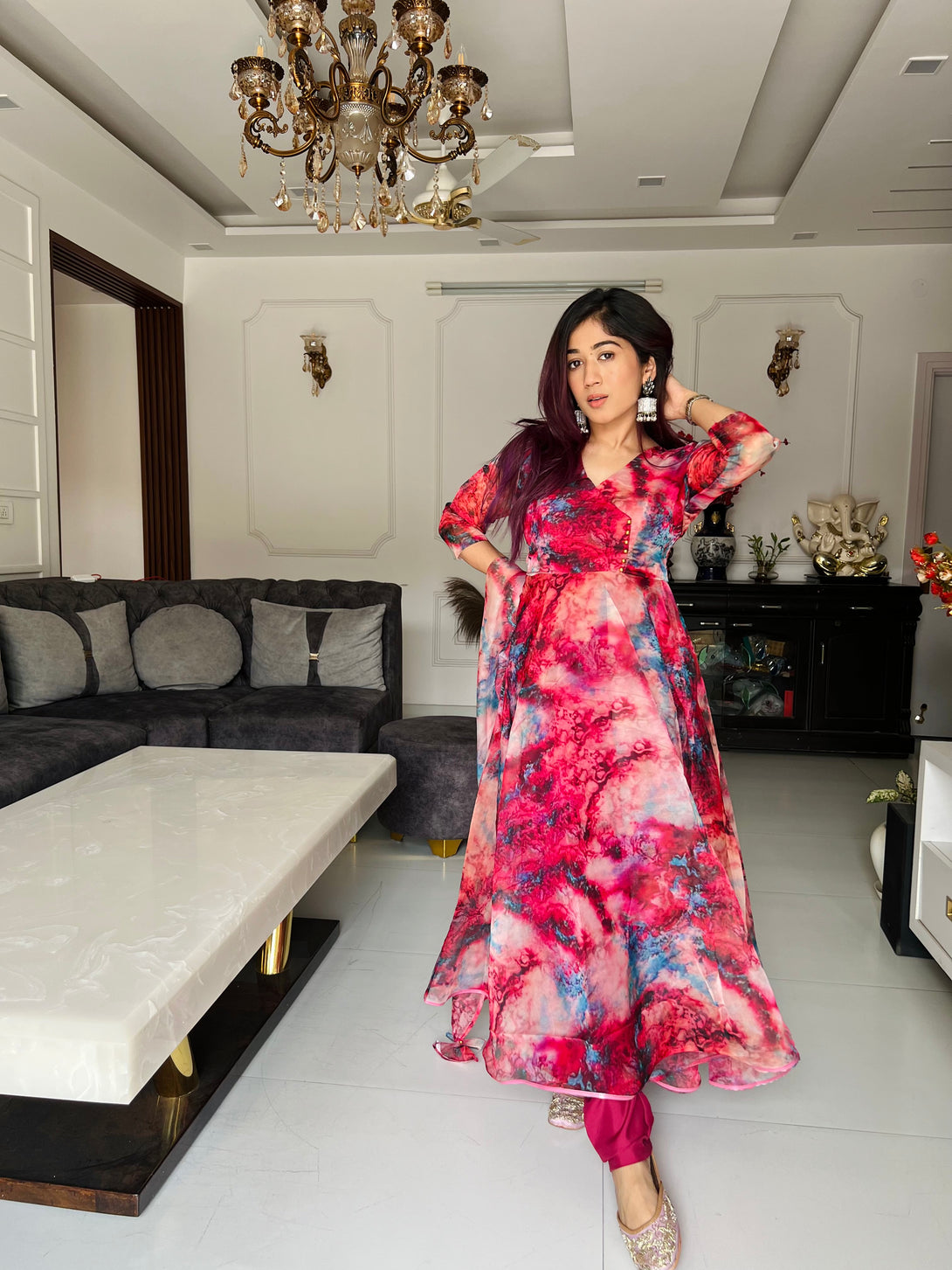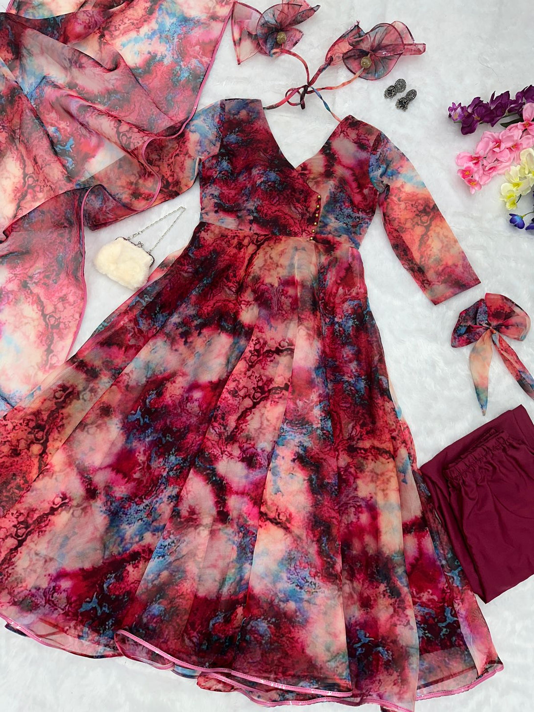 Presenting our mesmerizing Anarkali Suit crafted from pure organza silk, boasting a striking digital print and a luxurious flair, complemented by delicate lace border detailing. Accompanied by fully stitched butter cotton pants for optimal comfort and style. Complete the ensemble with the exquisite Organza Dupatta, featuring digital prints and an elegant lace border, adding a touch of sophistication to your attire.