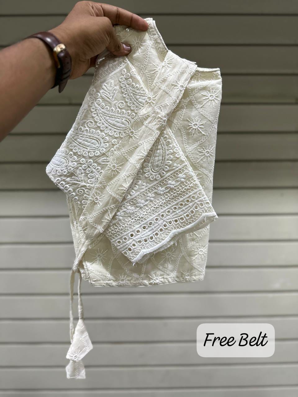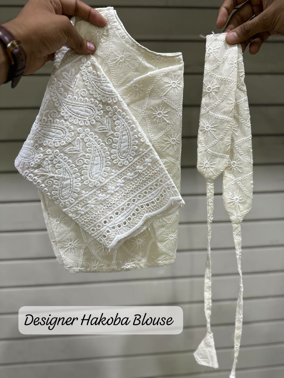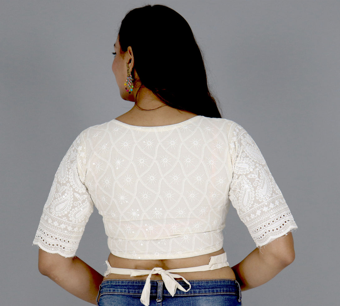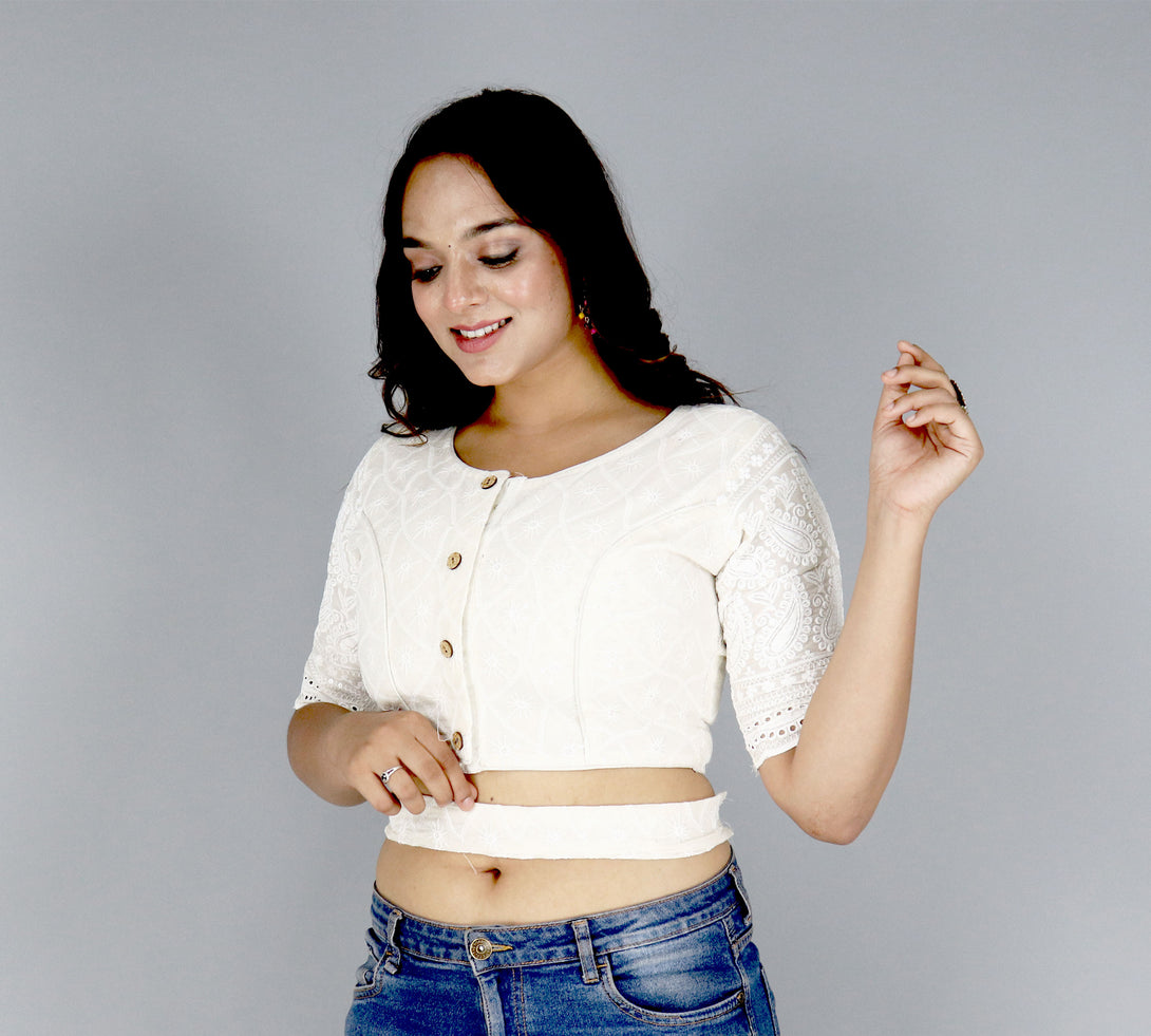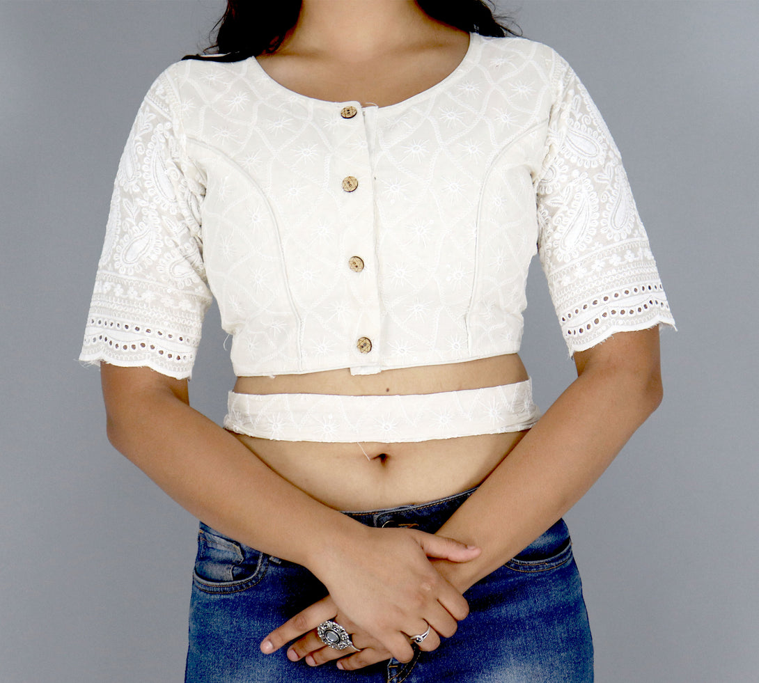 Indulge in comfort and style with our Pure Cotton Cambric Hakoba Non-Padded Cotton Lining Front Open Blouse. This Alterable Readymade Blouse is a perfect blend of elegance and ease. The design features 12-inch sleeves adorned with Heavy Cotton Thread Work and Sequence Work on the Daman, providing a touch of sophistication to your ensemble. The Front opens with a Hook and Fancy Button closure and the Boatneck pattern adds a modern twist to the traditional blouse design. The Cotton lining ensures a breathable and comfortable fit, while the Non-Padded feature offers a natural silhouette. Elevate your wardrobe with this chic and versatile blouse that combines fashion and comfort. Redefine your style with the perfect combination of craftsmanship and ease in this Pure Cotton Cambric Hakoba creation. - Non PaddedÂ