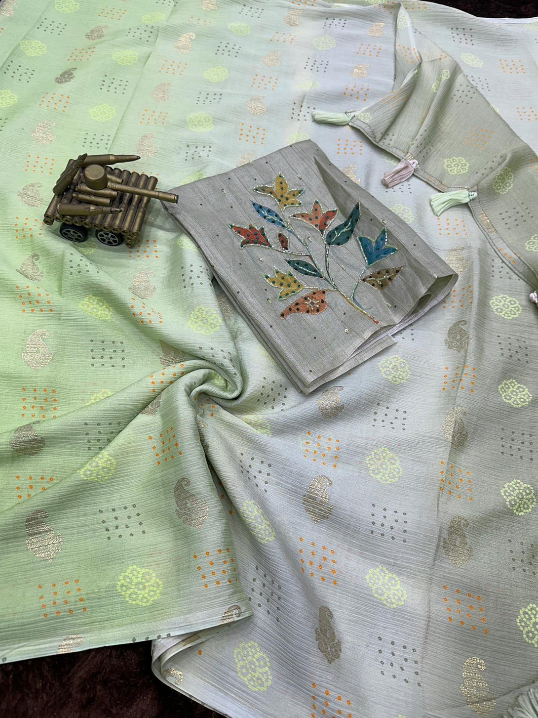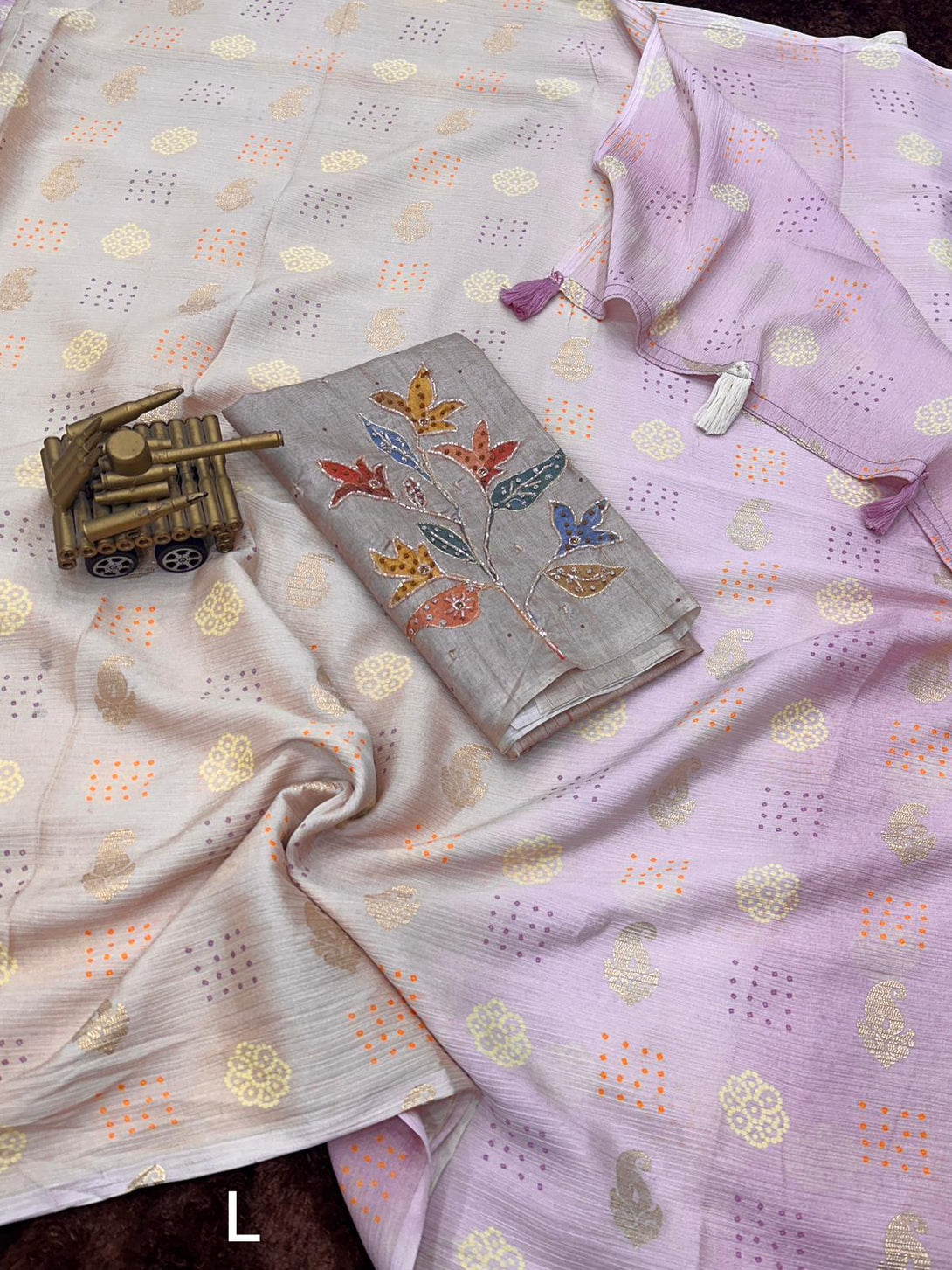 Designe-Saanjh 🌸 A perfect light weight saree with handwork blousein back side of blouse. Product details👇🏻 Pattern- Saree- 3D printed saree with a touch of ivory work & tussels in pallu. Blouse-printed with Multi color Bids handwork.
