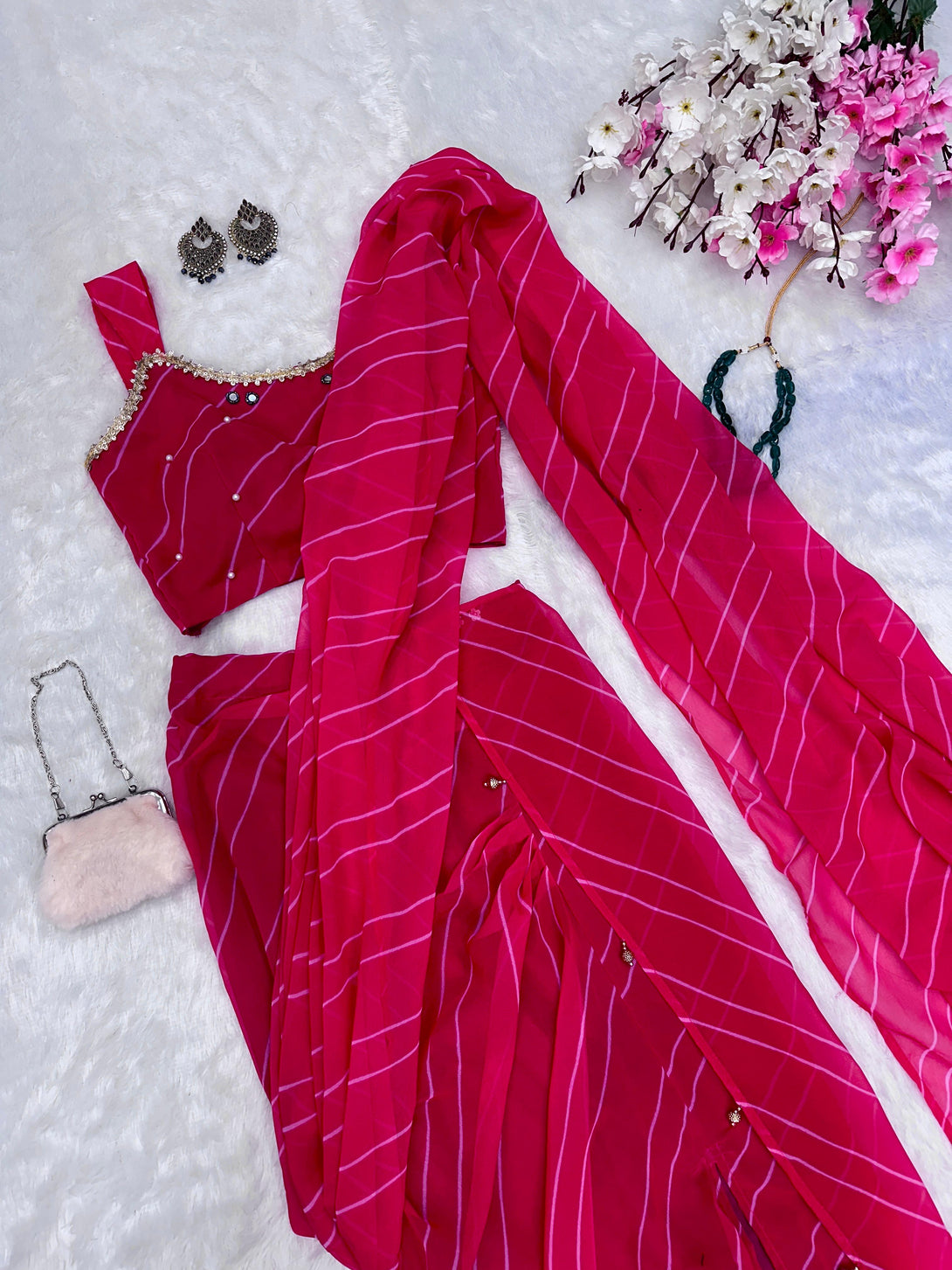 Crop Top Blouse: Georgette digital printed blouse with designer lace and pearl motif work. Comes padded for a perfect fit. Available in sizes 34 and 38 (with margin up to 42).