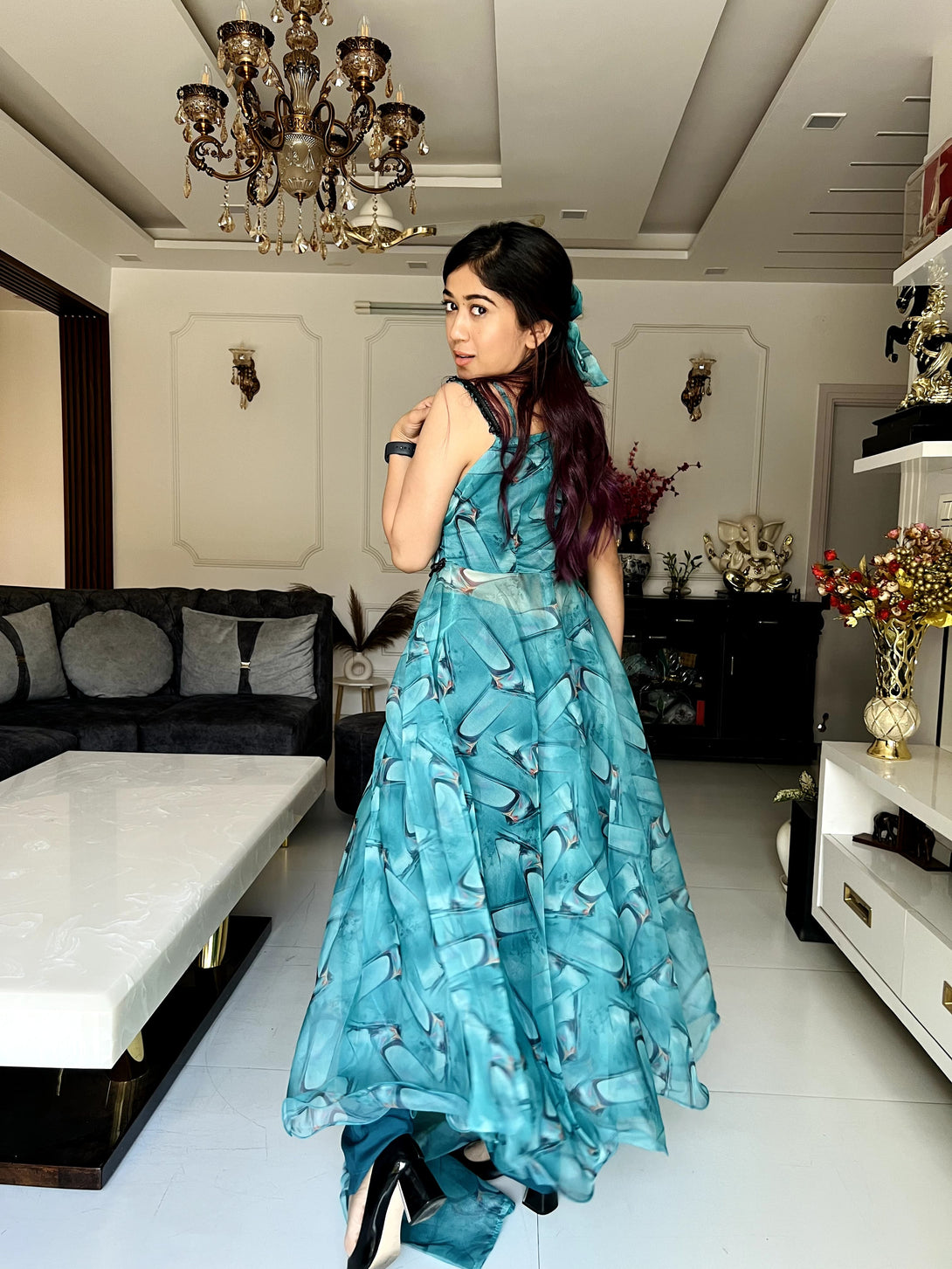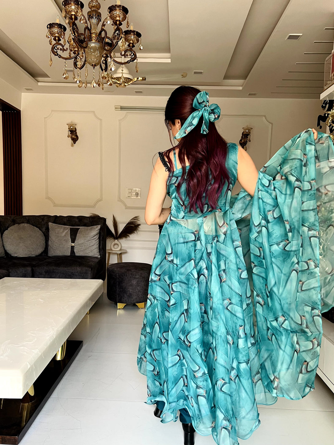 Digital printed organza silk Anarkali suit