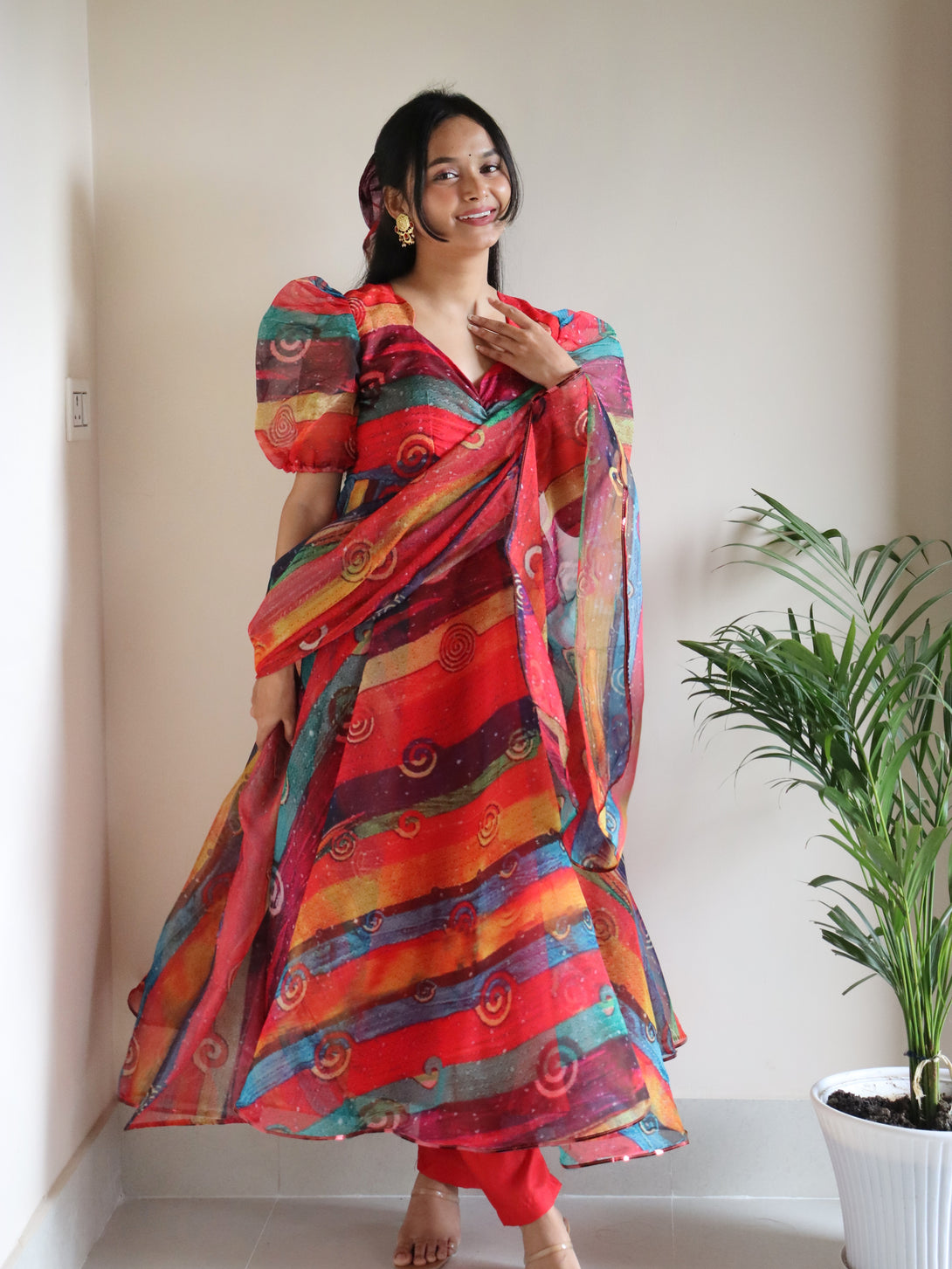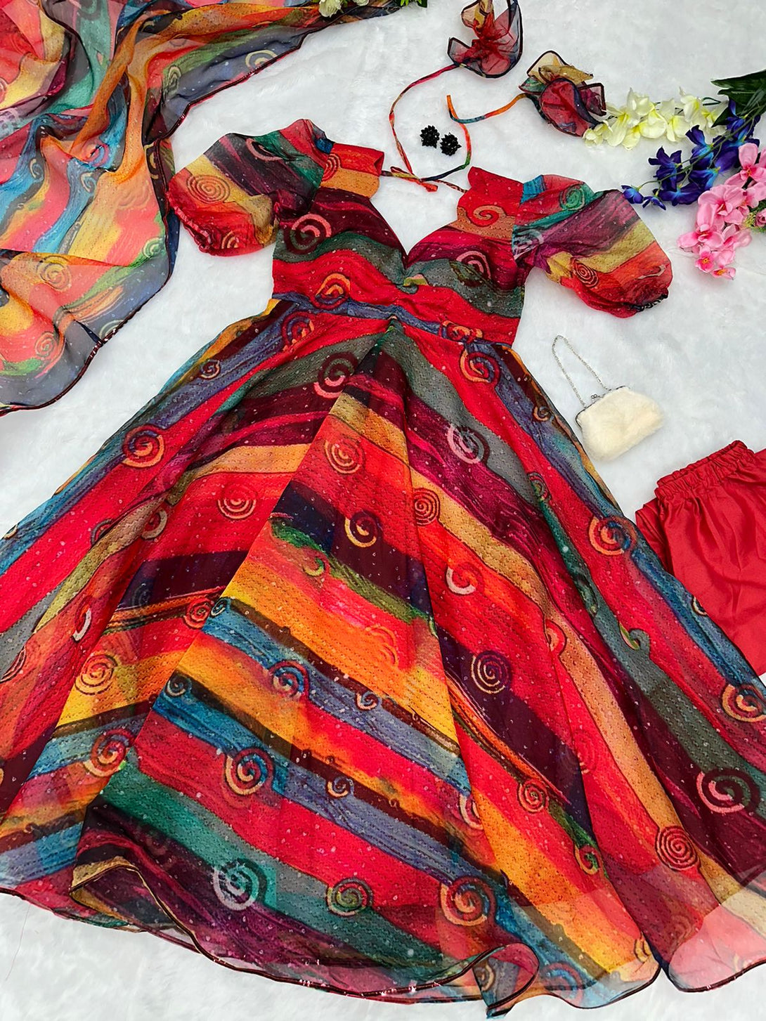 Anarkali - Digital printed pure organza silk Anarkali suit of huge flair with Lace Border