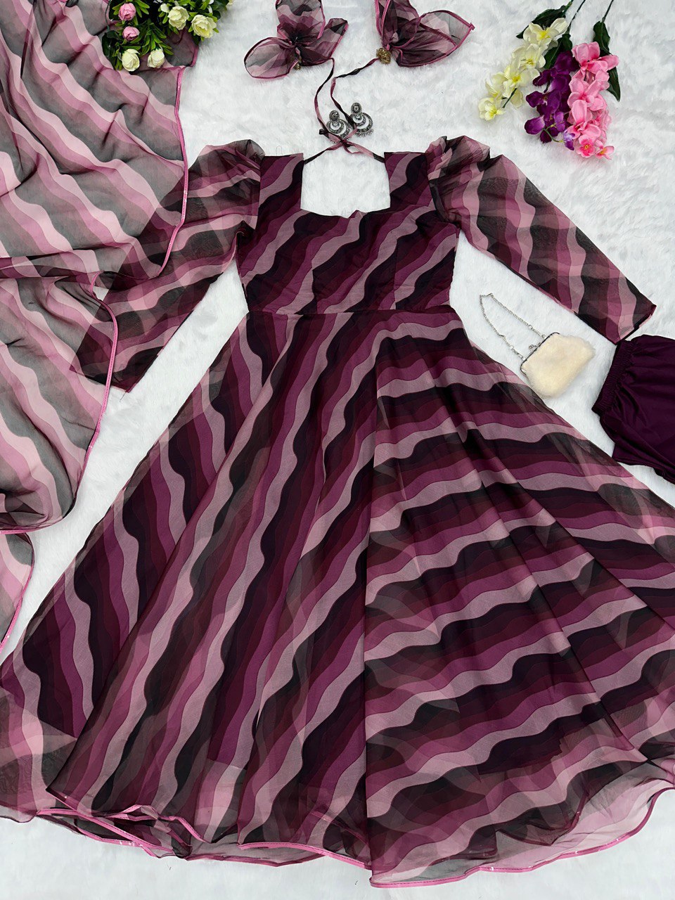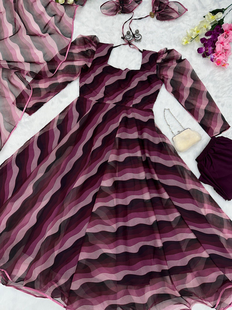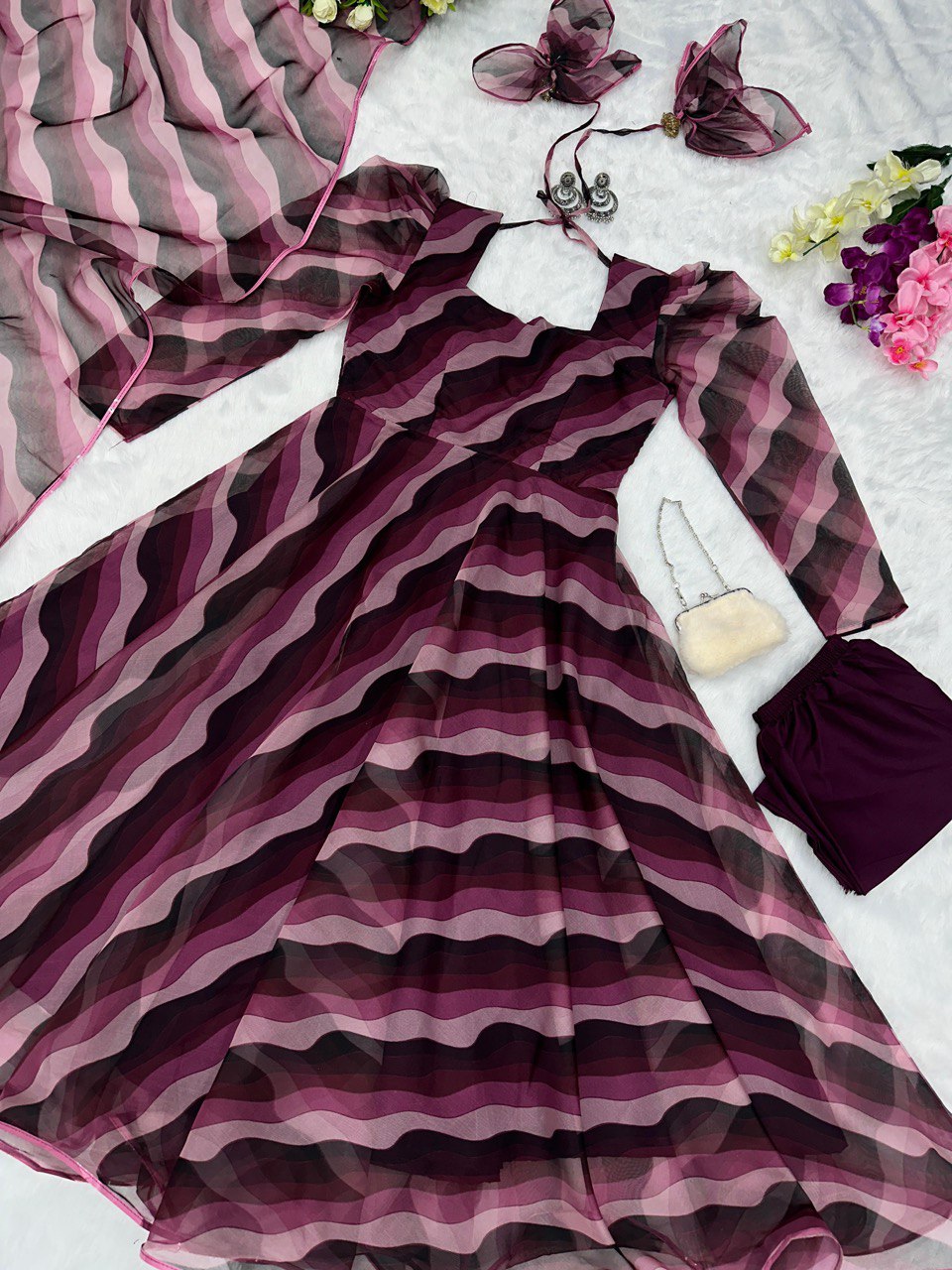 Introducing our captivating Digital Printed Pure Organza Silk Anarkali Suit, boasting a remarkable flair and adorned with a delicate Lace Border for added charm. Paired with fully stitched butter cotton pants, ensuring both comfort and style. Complete your ensemble with the Organza Dupatta, featuring digital prints and a Lace border, adding an elegant finishing touch to your attire.