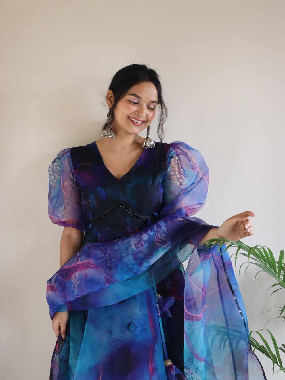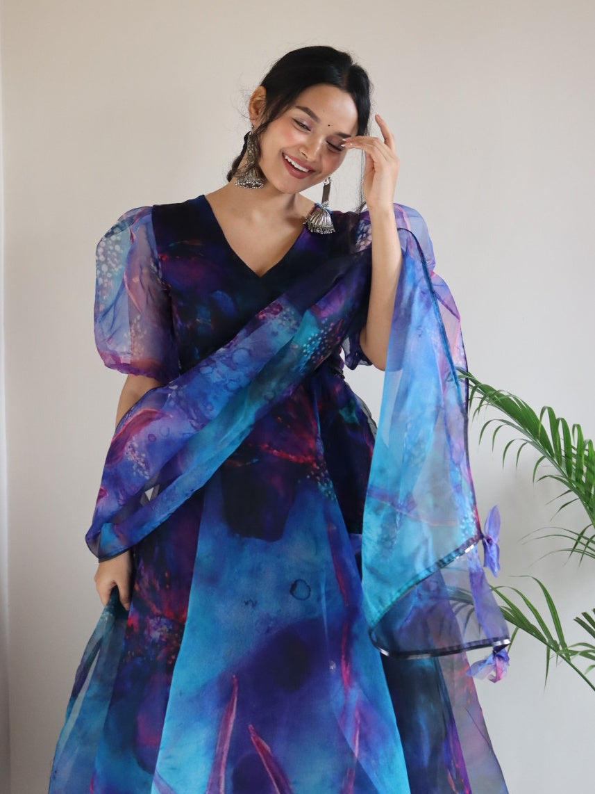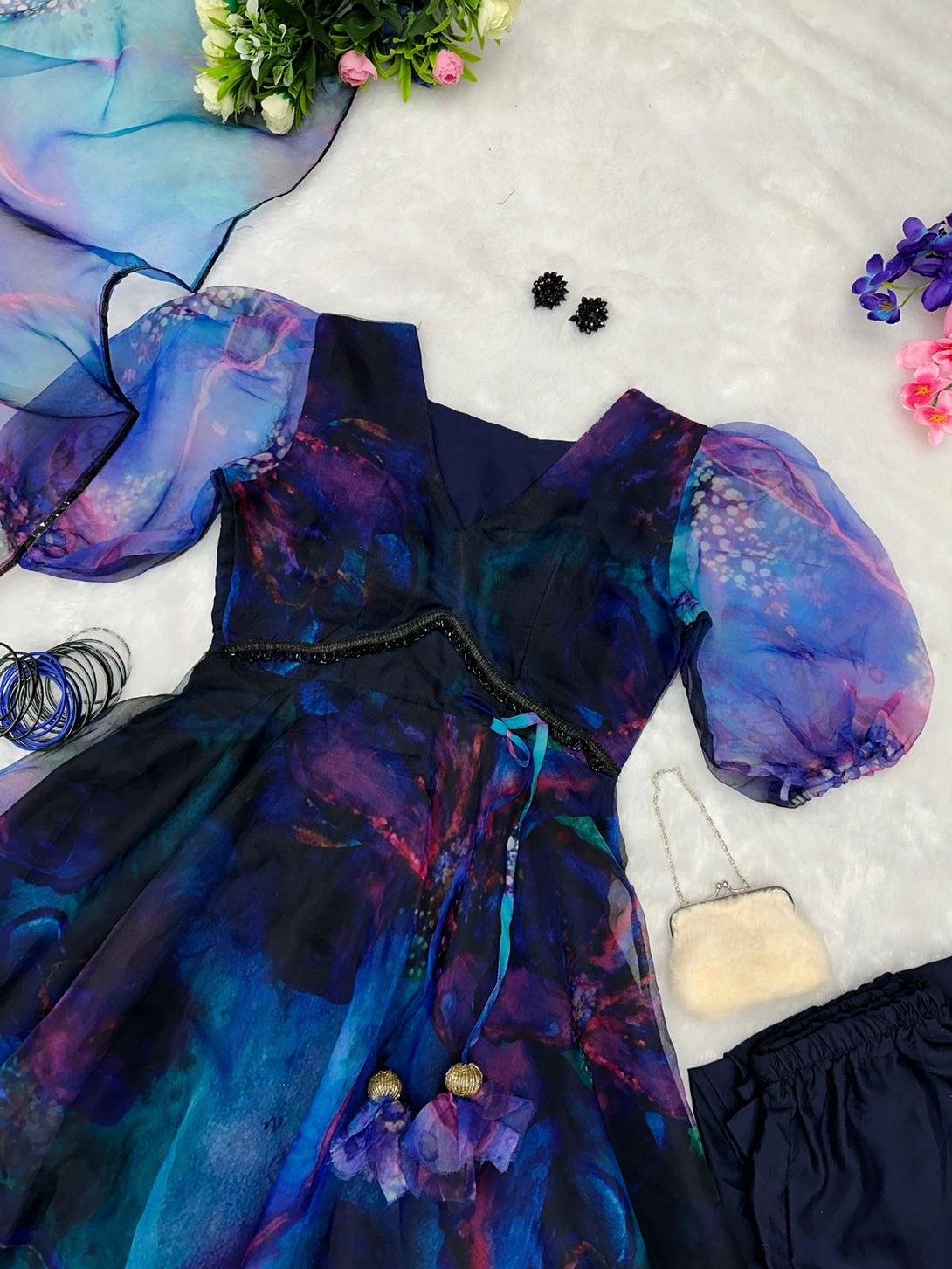 Digital printed pure Organza silk Anarkali suit of huge flair