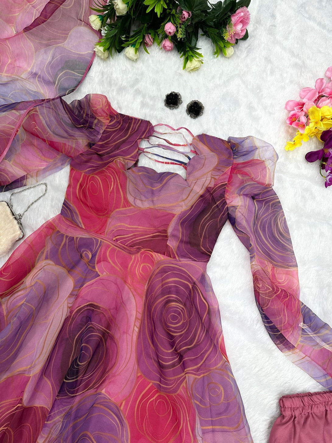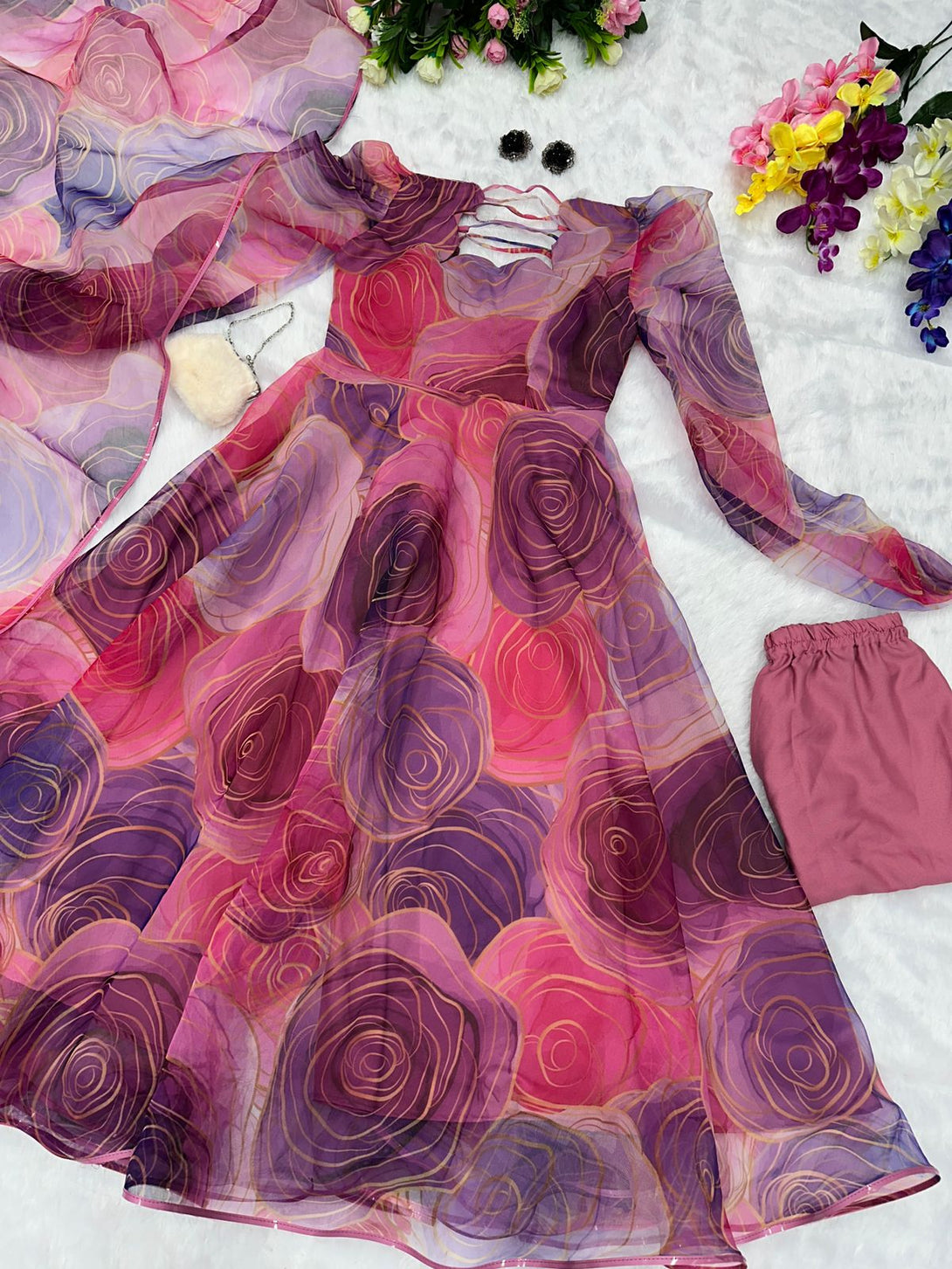 Digital printed pure organza silk Anarkali suit of huge flair with Lace Border