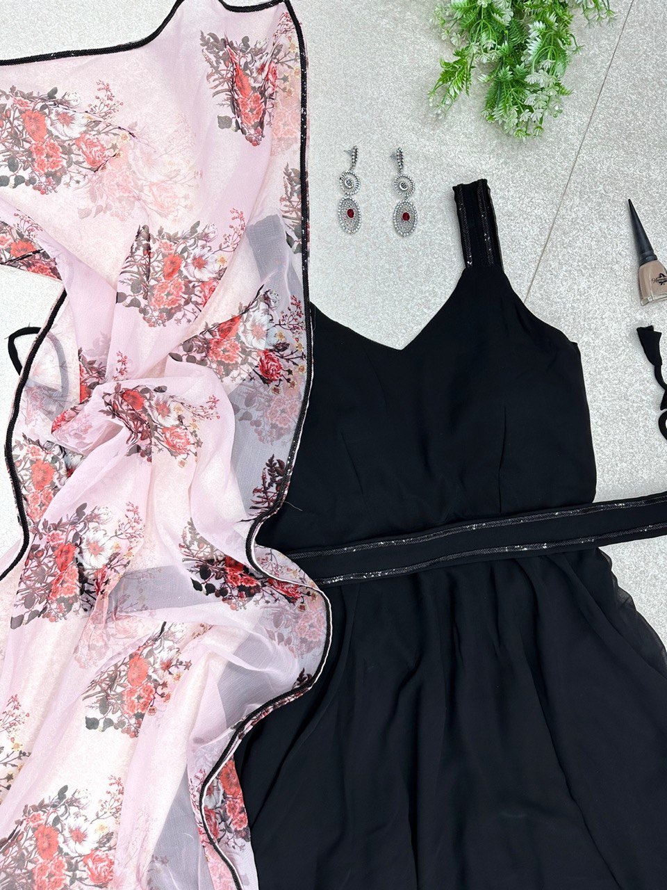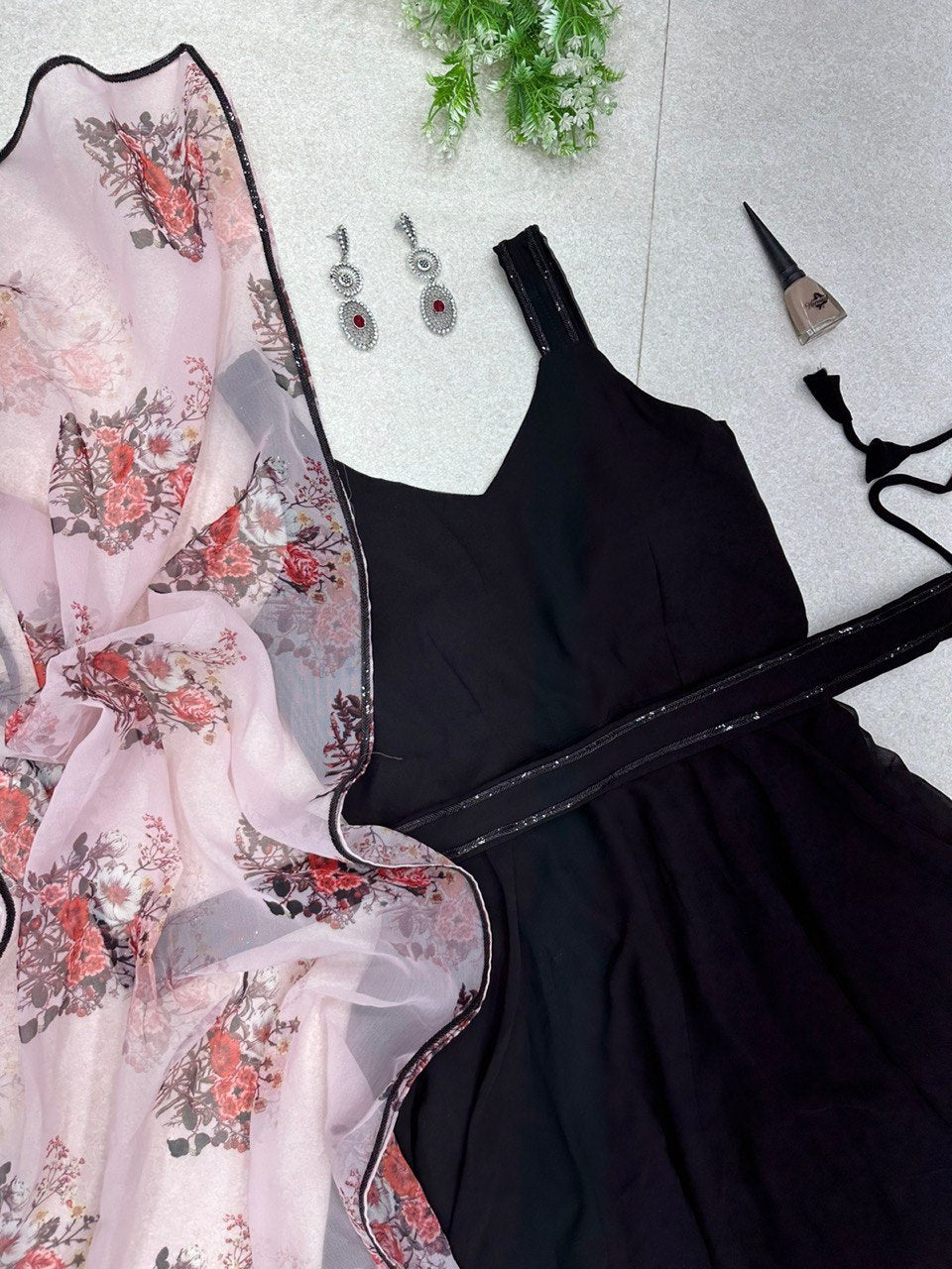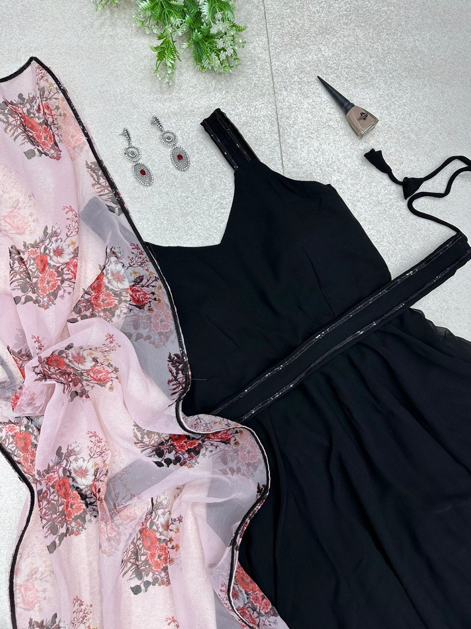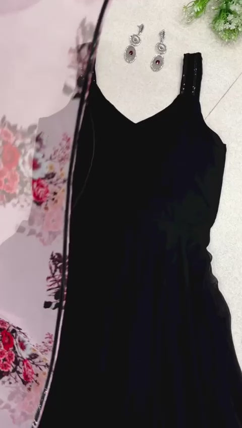 Experience the perfect blend of simplicity and elegance with our Faux Georgette Anarkali Suit. The plain top provides a versatile canvas, allowing you to showcase your style, while the thoughtful details elevate the ensemble to new heights. The Sleeveless design with a V neckline adds a touch of modern sophistication, providing a flattering and graceful look. Paired seamlessly with a Floral Print Dupatta featuring lace detailing on the edges, this suit celebrates the beauty of natural prints and intricate craftsmanship. To enhance the waistline and add a touch of shimmer, the suit comes with a Shimmery Detailed Belt. The belt not only provides a defined silhouette but also adds a subtle element of glamour to the overall ensemble.