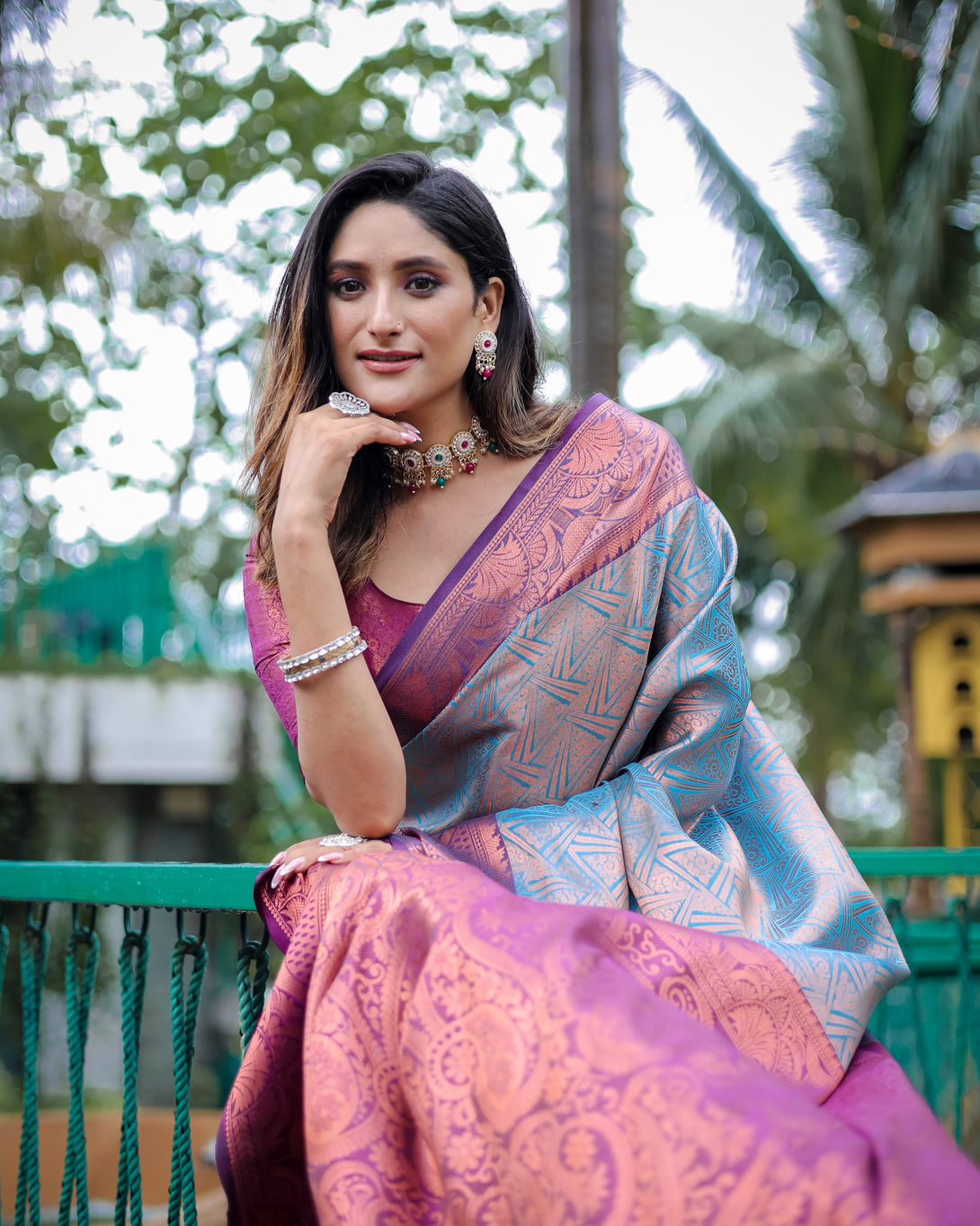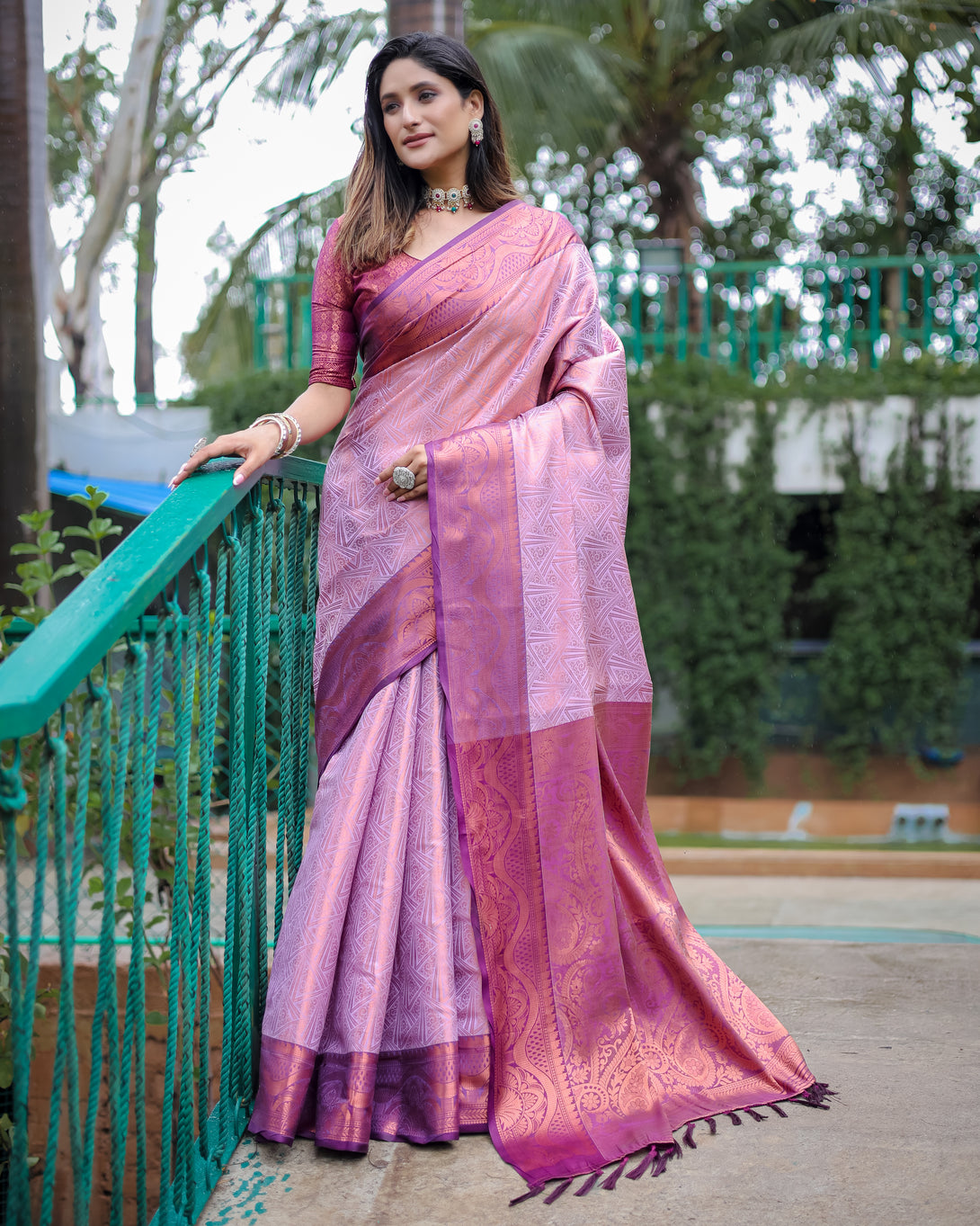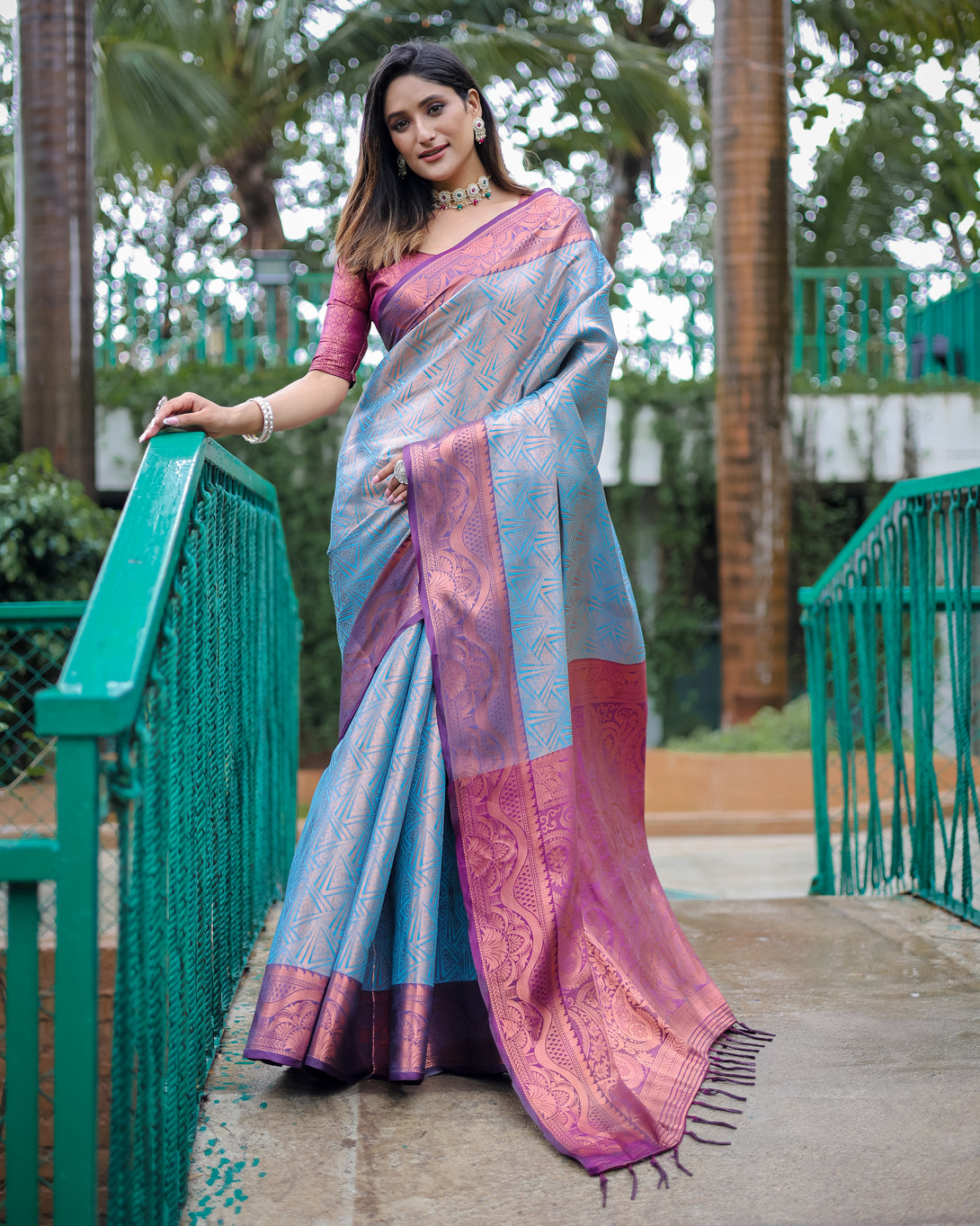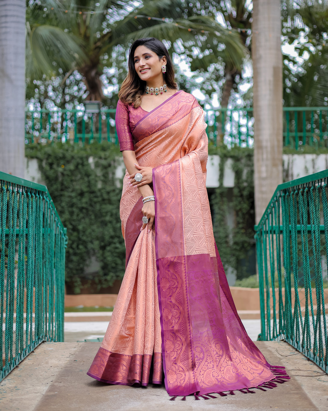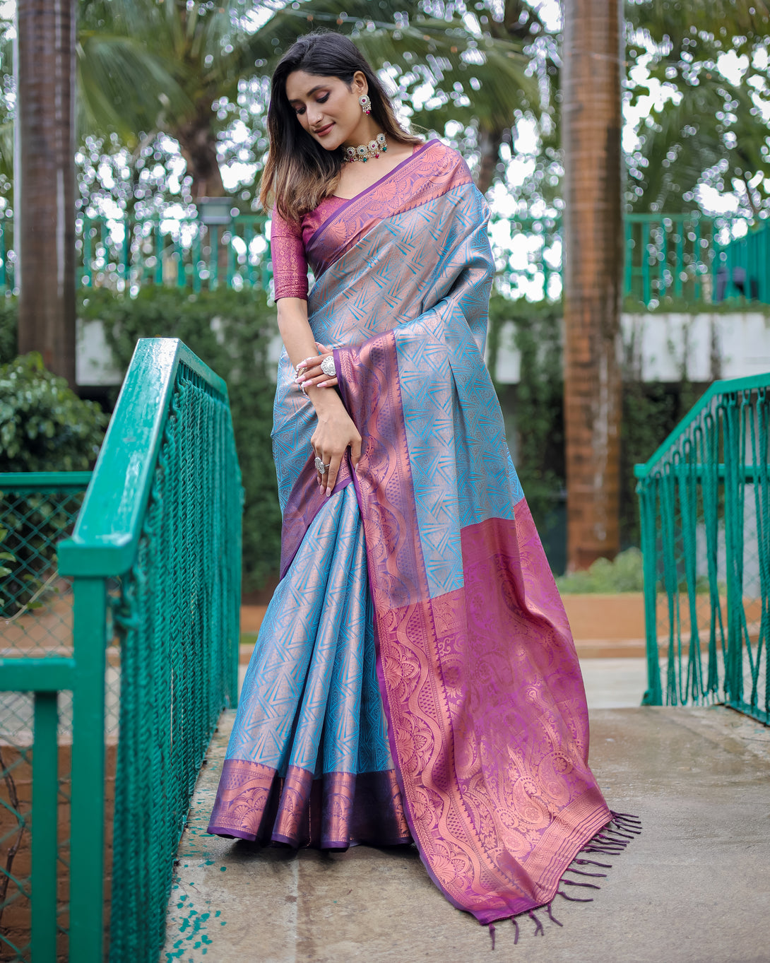 Kubera Pattu kanjivaram silk Chap dyeing copper zari Silk with two tone Border, contrast Rich Pallu And Brocade Blouse