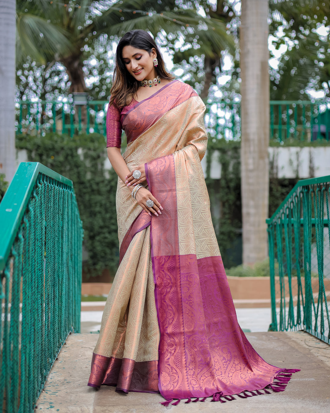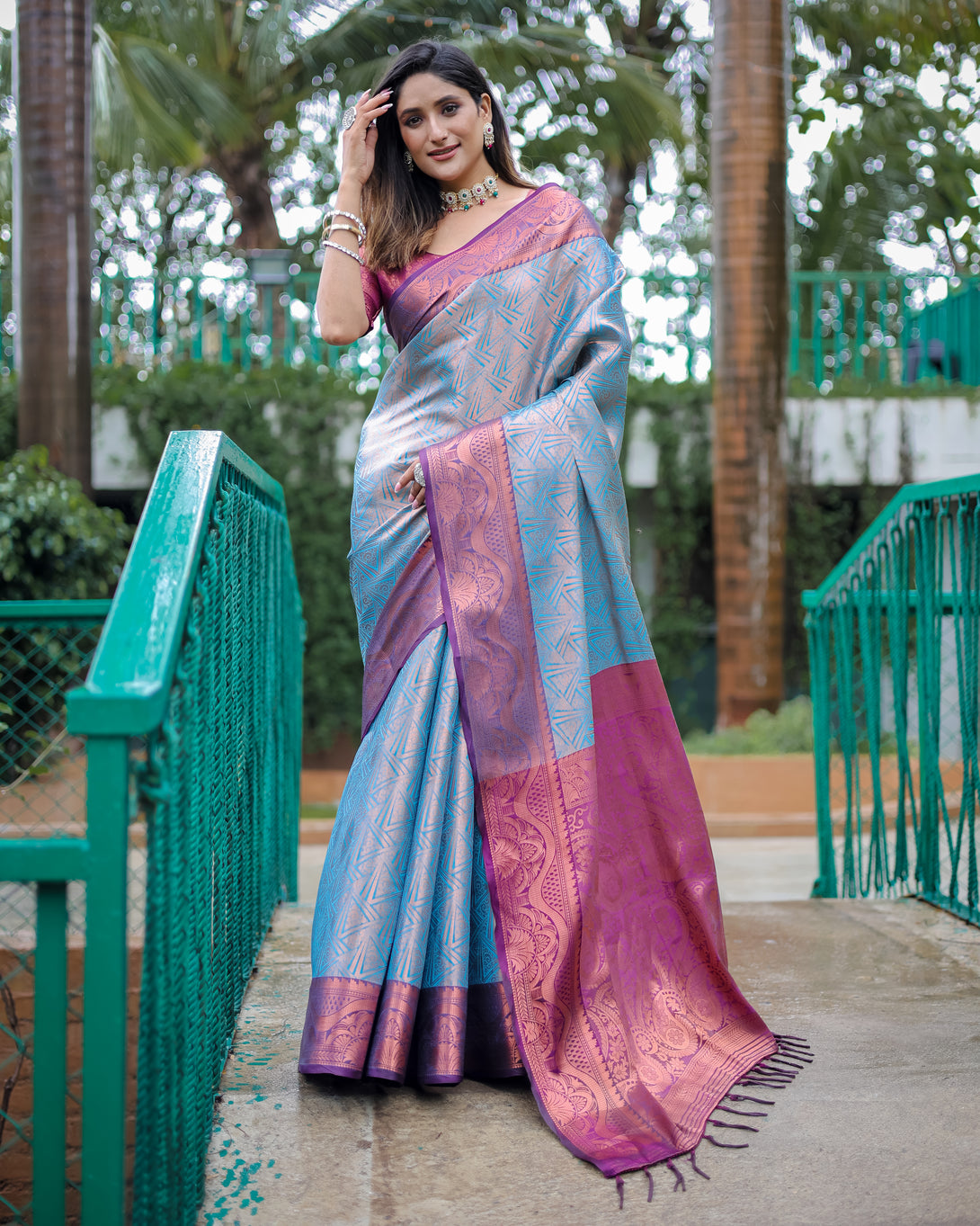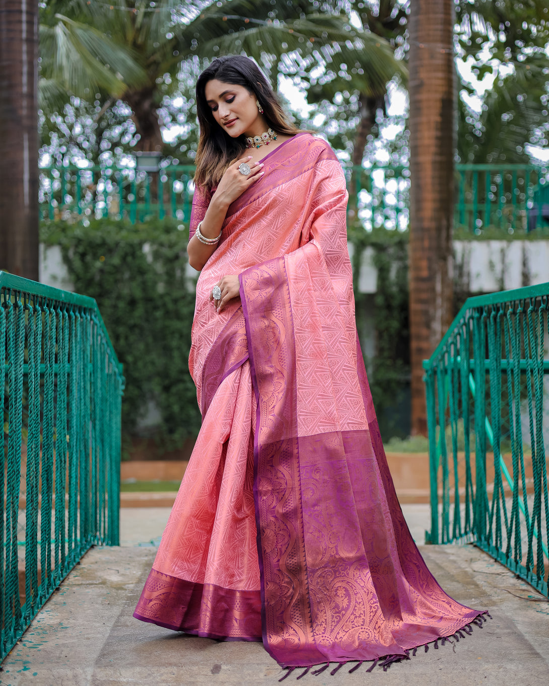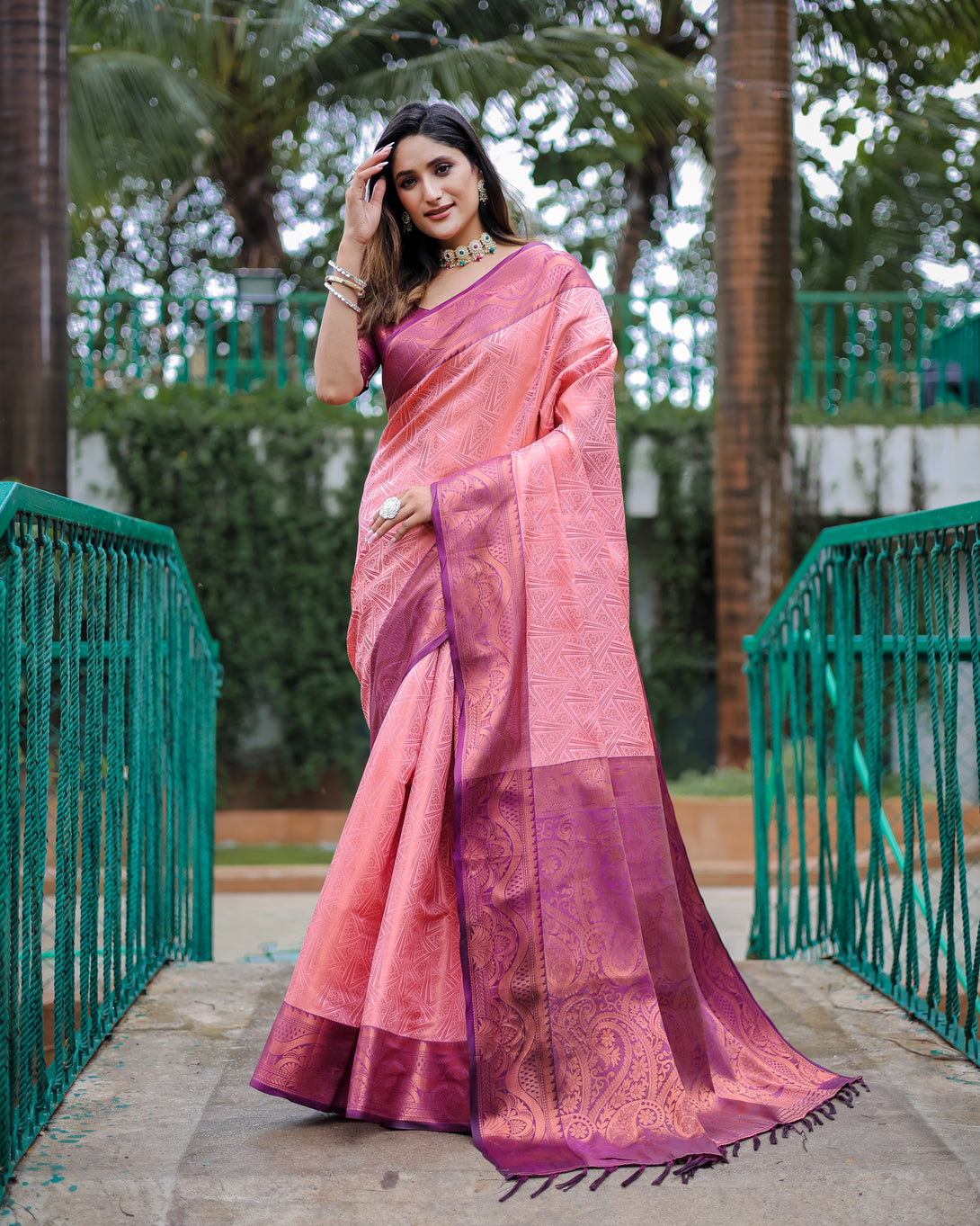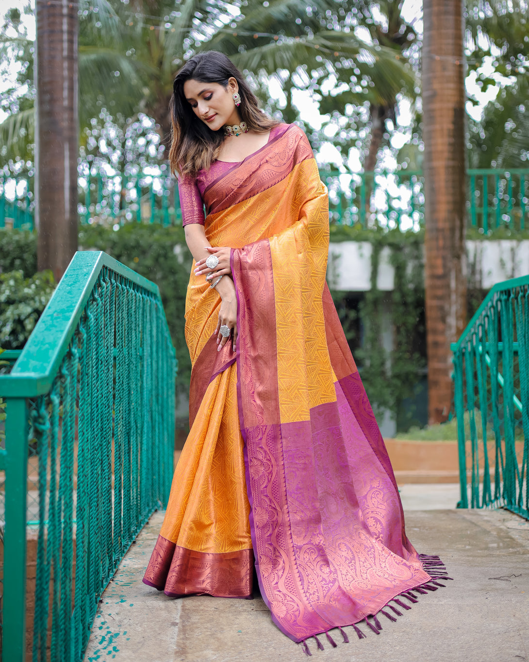 Kubera Pattu kanjivaram silk Chap dyeing copper zari Silk with two tone Border, contrast Rich Pallu And Brocade Blouse