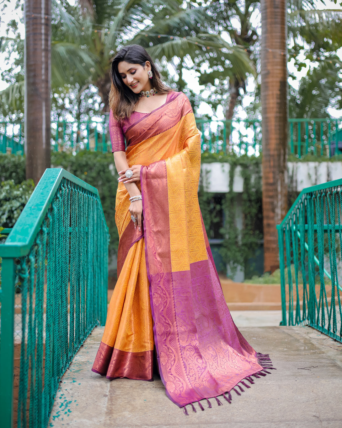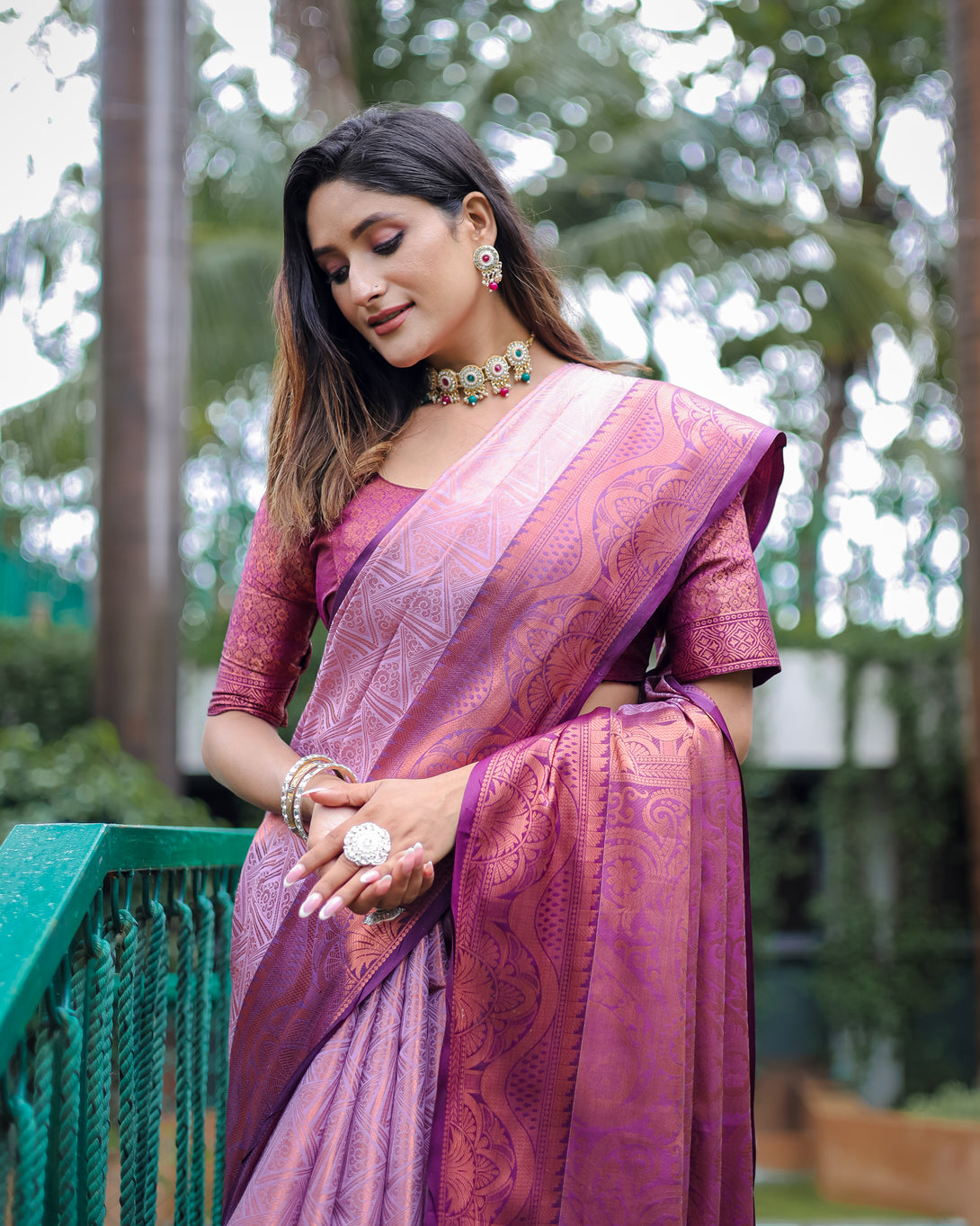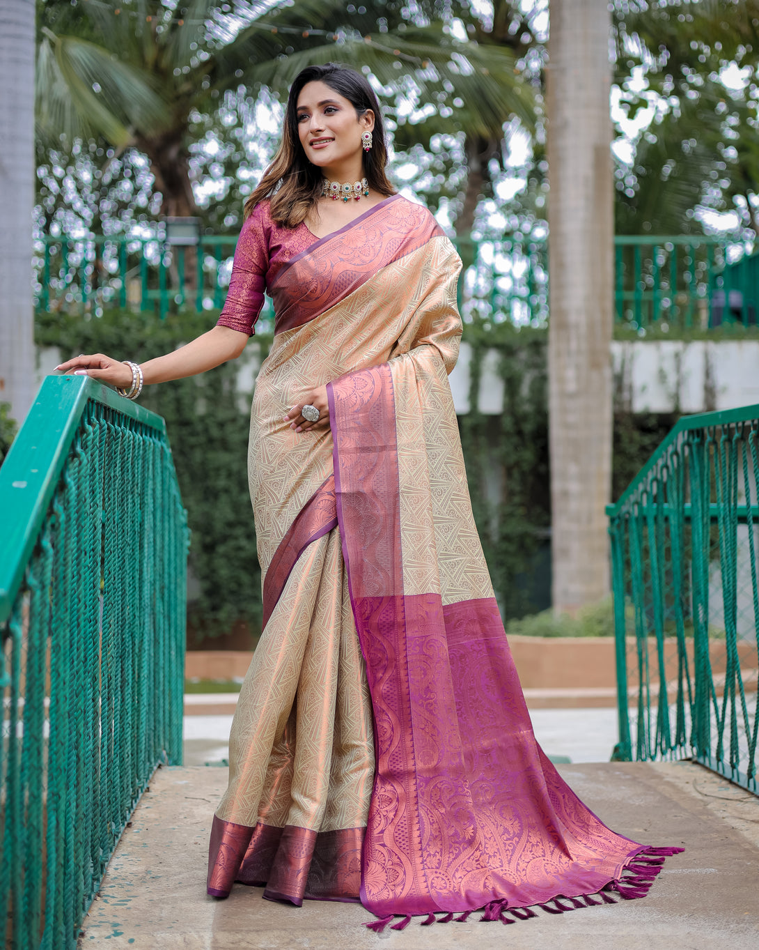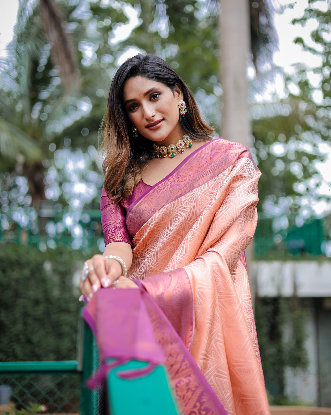 Kubera Pattu kanjivaram silk Chap dyeing copper zari Silk with two tone Border, contrast Rich Pallu And Brocade Blouse
