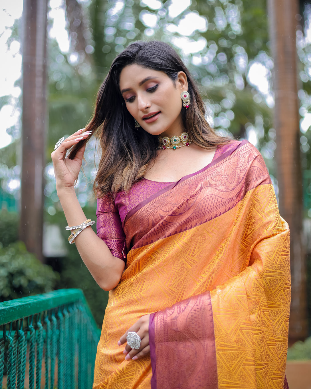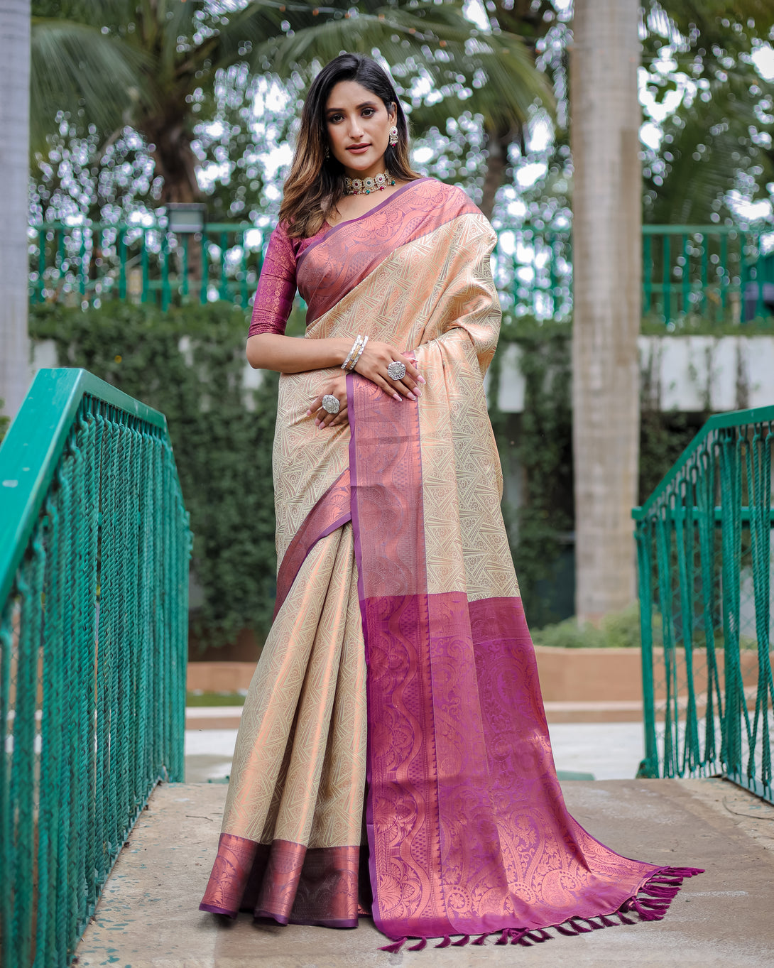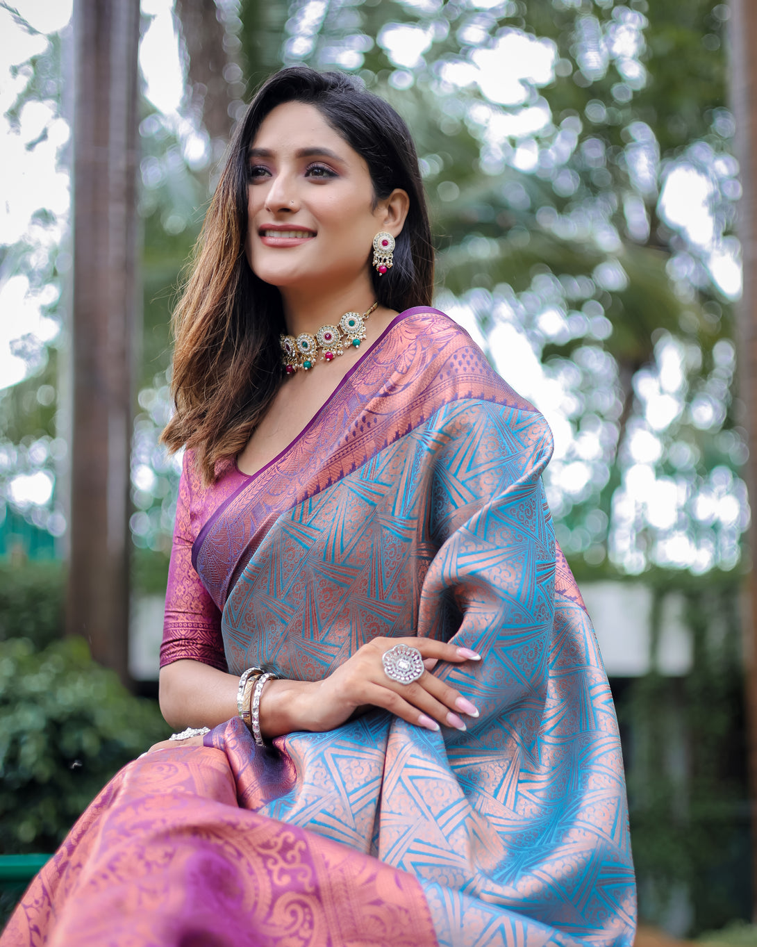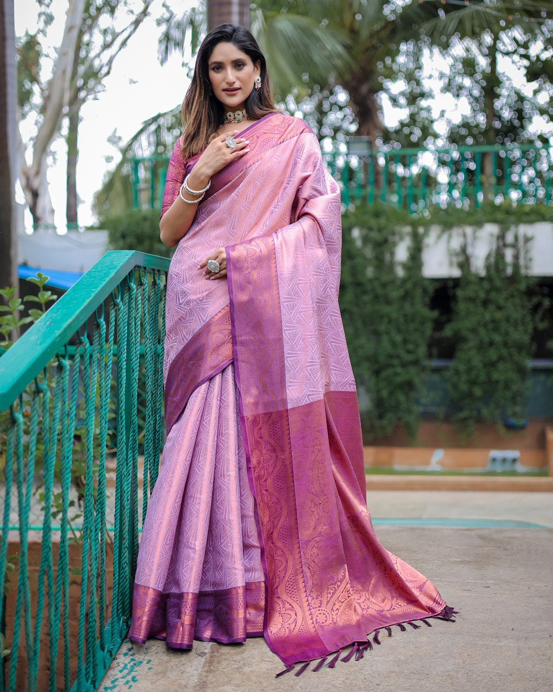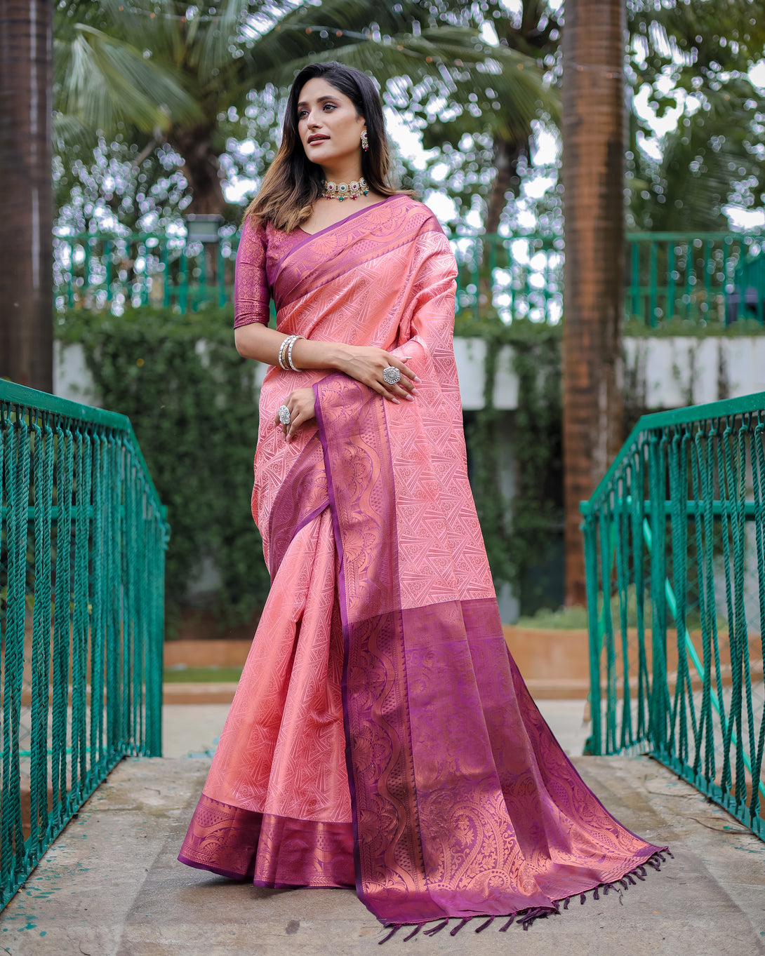 Kubera Pattu kanjivaram silk Chap dyeing copper zari Silk with two tone Border, contrast Rich Pallu And Brocade Blouse