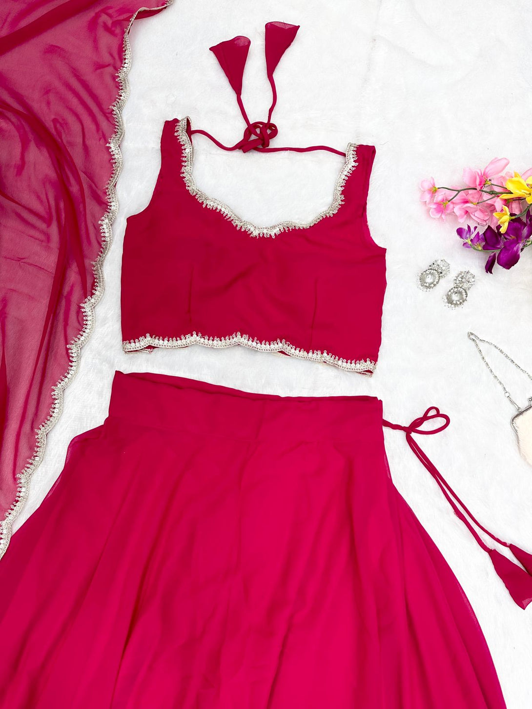 Indulge in sophistication with our Fully Stitched Pure Georgette Lehenga set. The fully stitched blouse, crafted from pure georgette, showcases intricate embroidery and sequins work, offering a perfect fit for sizes 38 with margin on both sides. The lehenga exudes charm with its pure georgette fabric and fully stitched design, featuring an impressive 8-meter flair and canvas patta. Complete your ensemble with the pure georgette dupatta, adorned with matching embroidery and sequins work, adding a touch of glamour to your look.