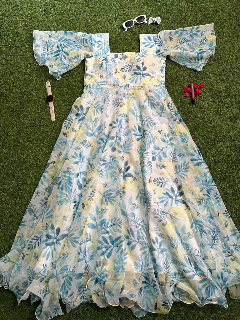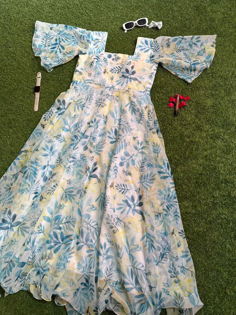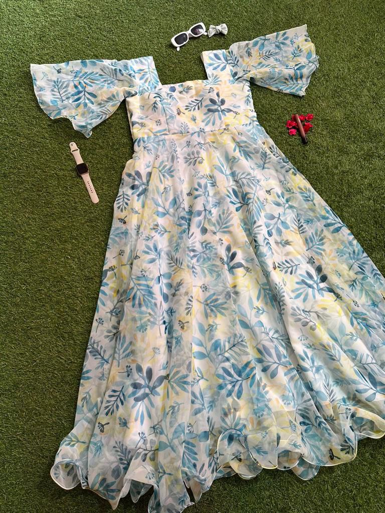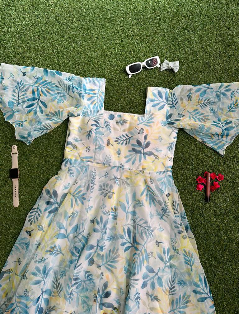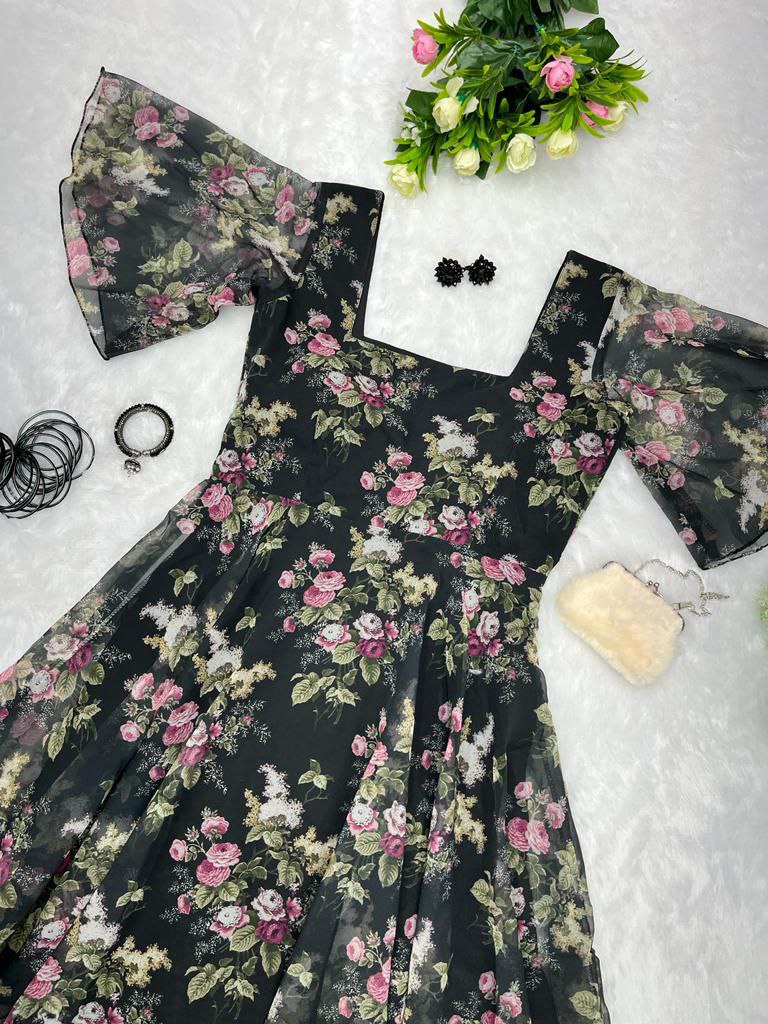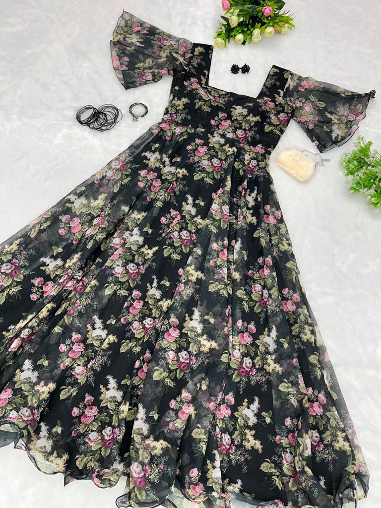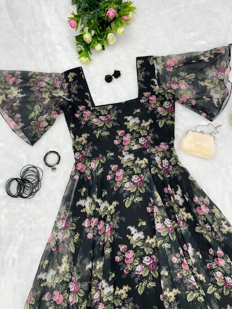 Indulge in the timeless elegance of our Floral Print Georgette Silk Maxi Dress. Adorned with a captivating floral pattern, this dress features a graceful silhouette accentuated by a generous flair and enchanting butterfly sleeves. The square neckline adds a touch of sophistication, while the uneven hemline creates a playful and stylish look. Crafted from luxurious Georgette Silk, this maxi dress is perfect for those special occasions where making a statement is a must. Elevate your style and embrace the beauty of this enchanting ensemble.