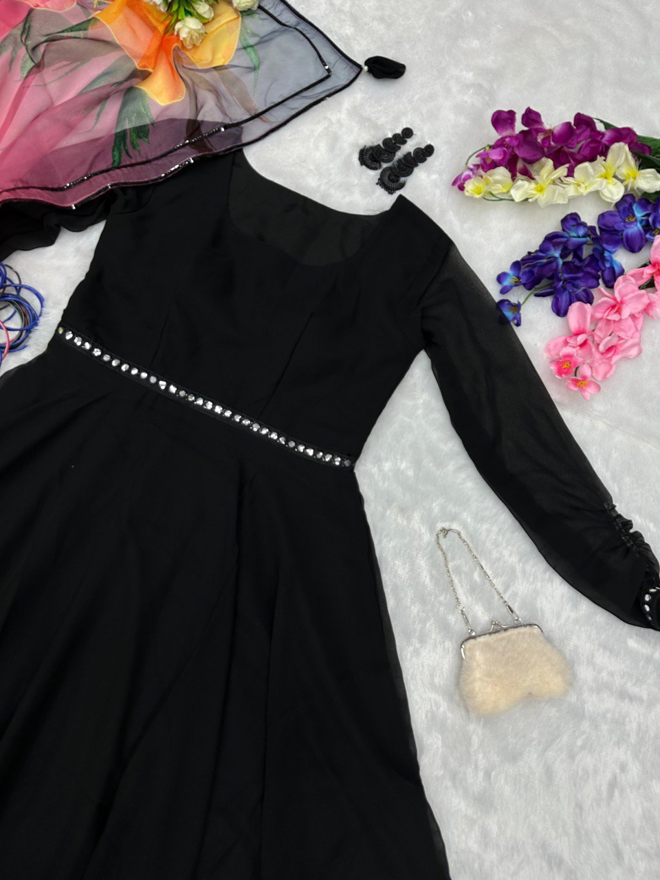 Introducing our sophisticated Plain Georgette Gown, featuring a designer lace pattern and an impressive 8-meter flair for a graceful silhouette. Complete your ensemble with the Organza Dupatta, adorned with designer tassels, adding a touch of elegance to your look.