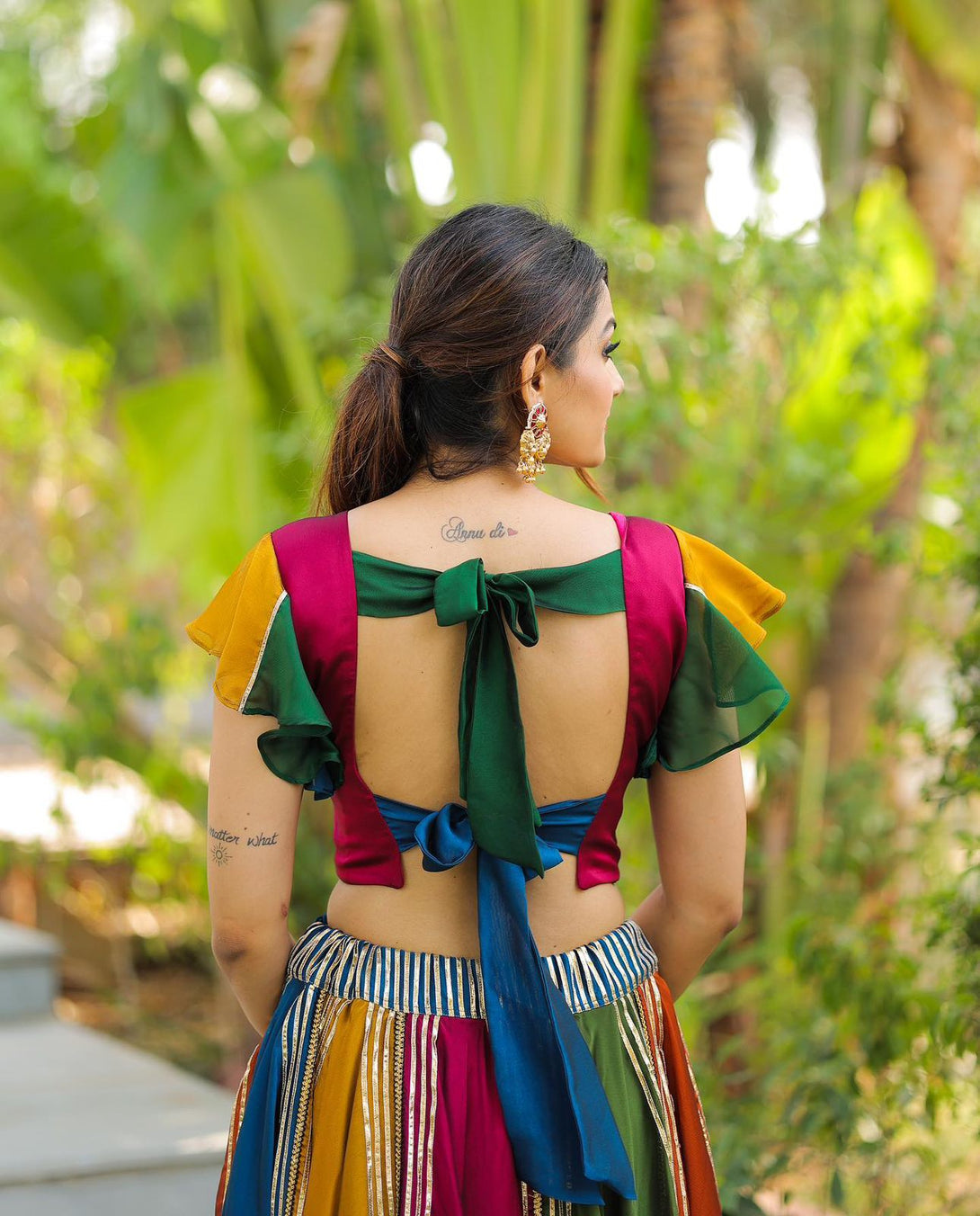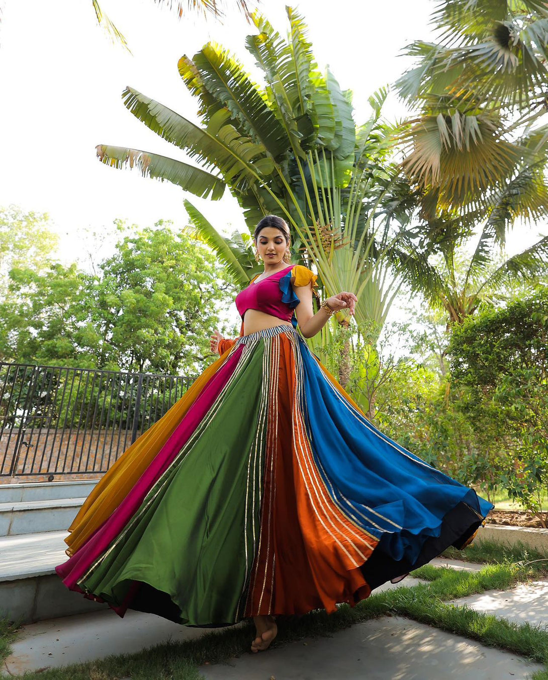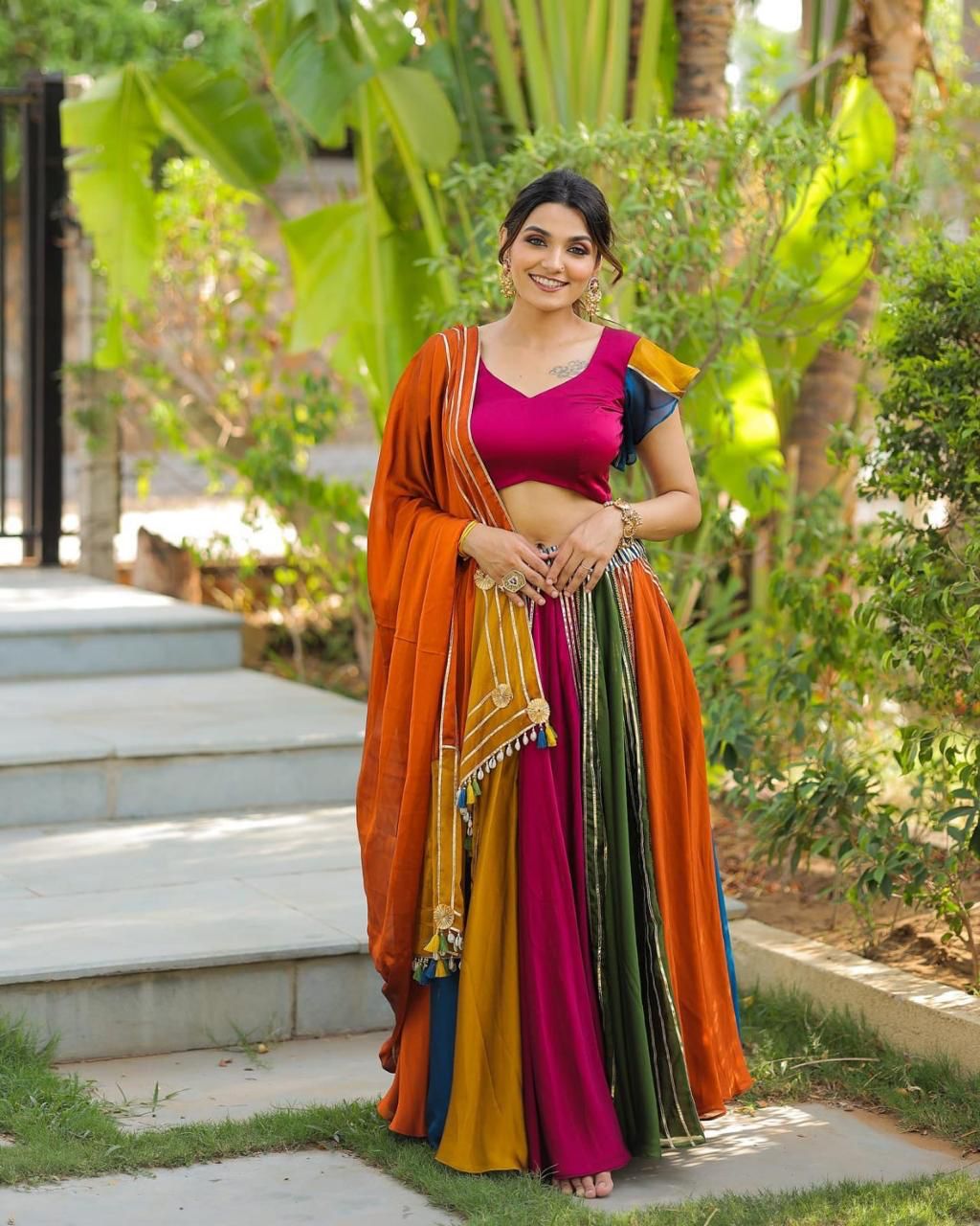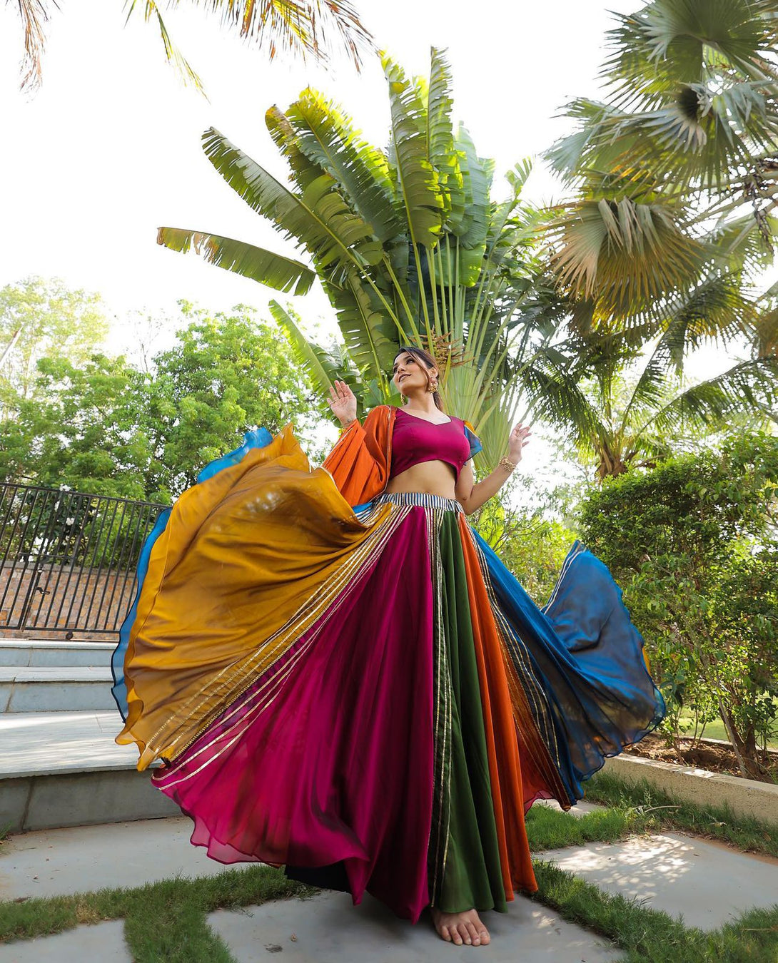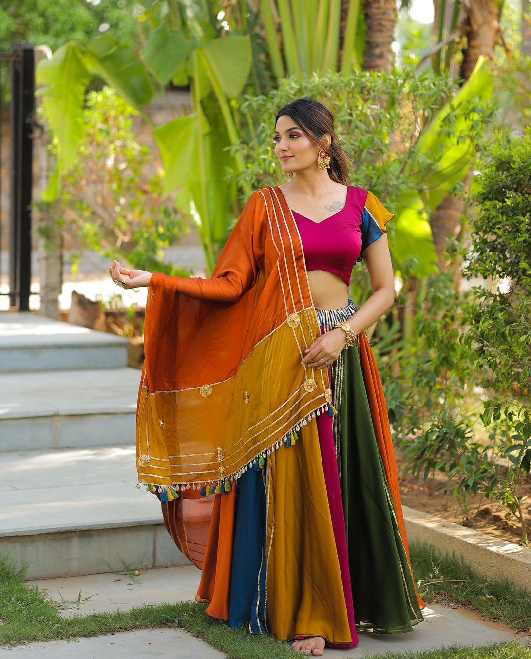 Get ready to shine in the Tepi Creation Navratri Special Pure Chinon Lehenga Choli – a celebration of style and tradition. The fully stitched Choli, crafted from luxurious Pure Chinon fabric and lined with Micro Cotton, sets the stage for a festive and comfortable experience. The Lehenga, also made from Pure Chinon, features exquisite Gota Patti Lace Work, adding a touch of elegance to its 4.50-meter flair. Available in size 44, this ensemble is designed to make you stand out during the celebrations. The Dupatta, crafted from Pure Chinon with a size of 2.30 meters, showcases a Gota Patti Lace Border, completing the look with finesse. With availability "In Stock," this Pure Chinon Lehenga Dress is not just an outfit; it's an expression of timeless style, ready to adorn you for the festivities.
