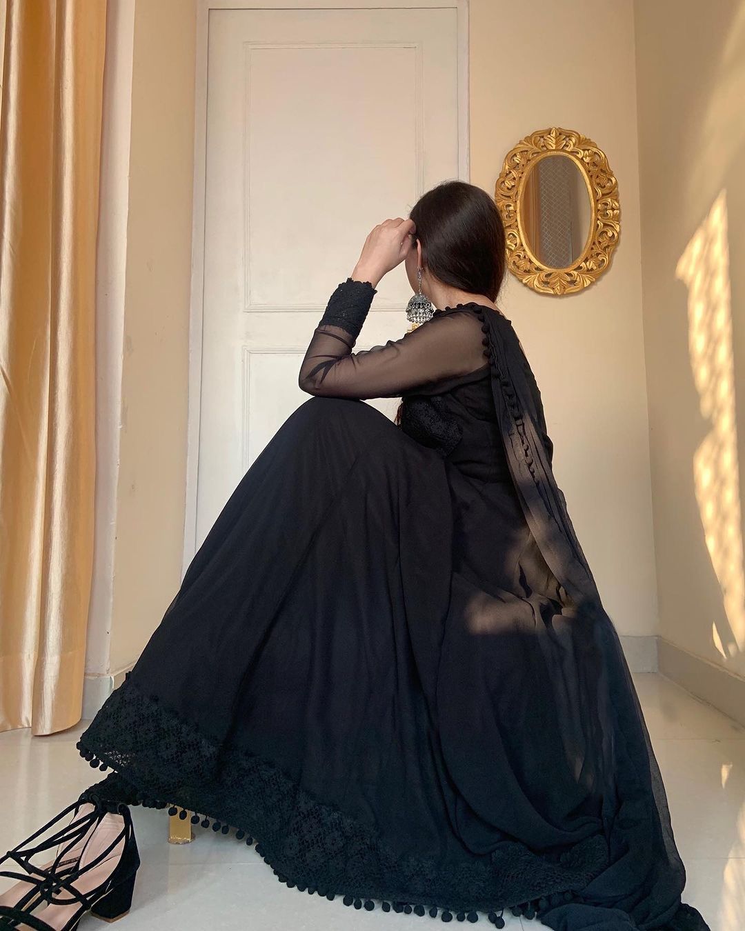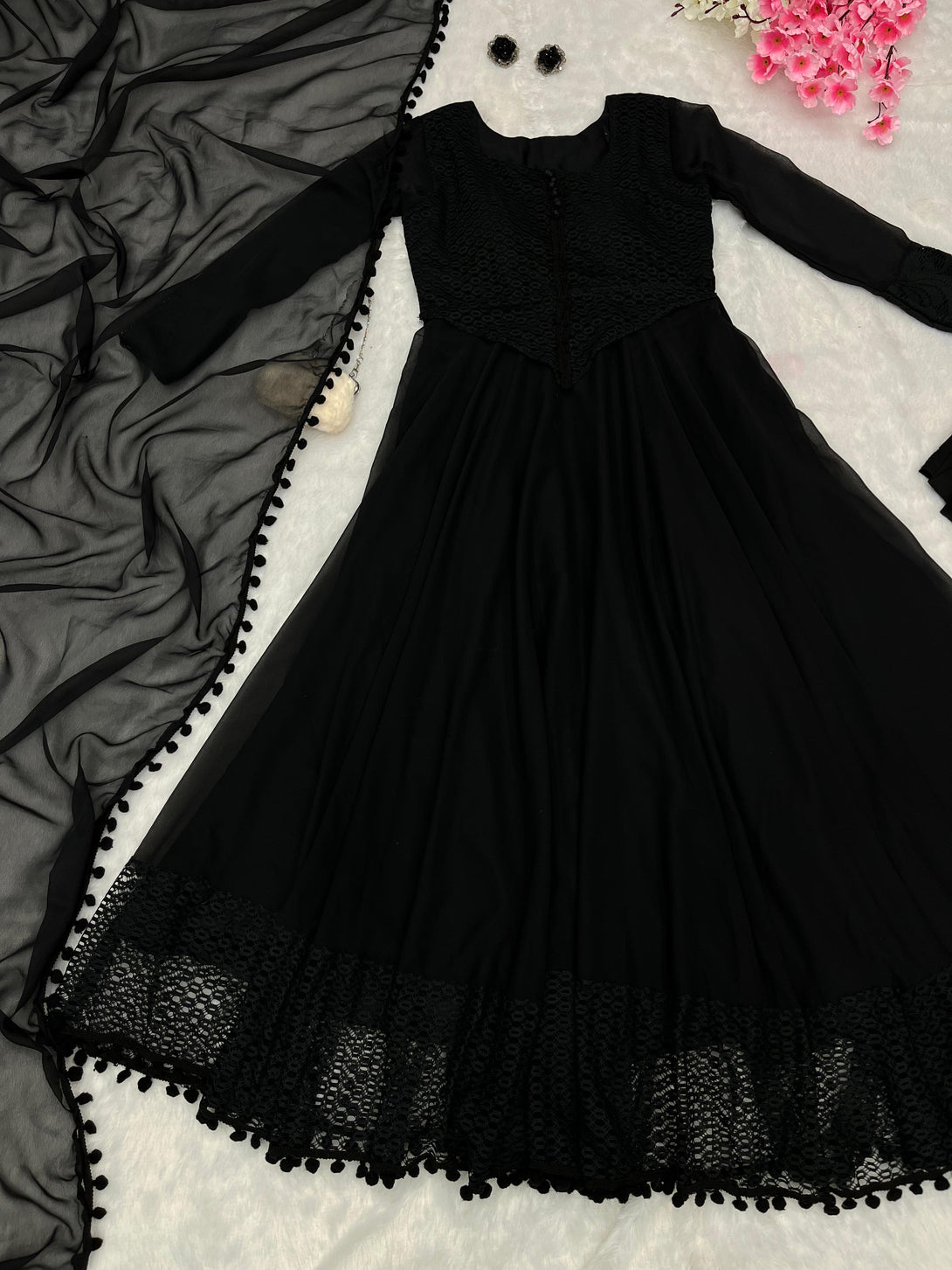 pure georgette Anarkali suit of huge flair with fancy Net and pompom Lace Border