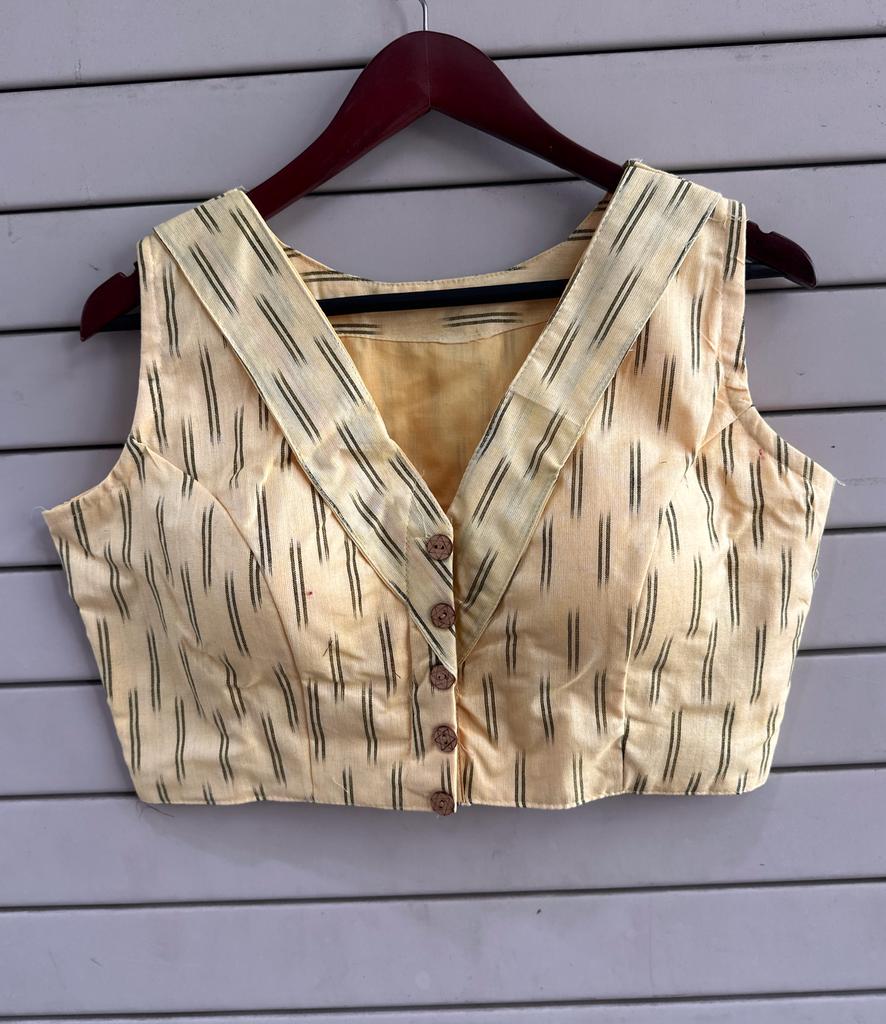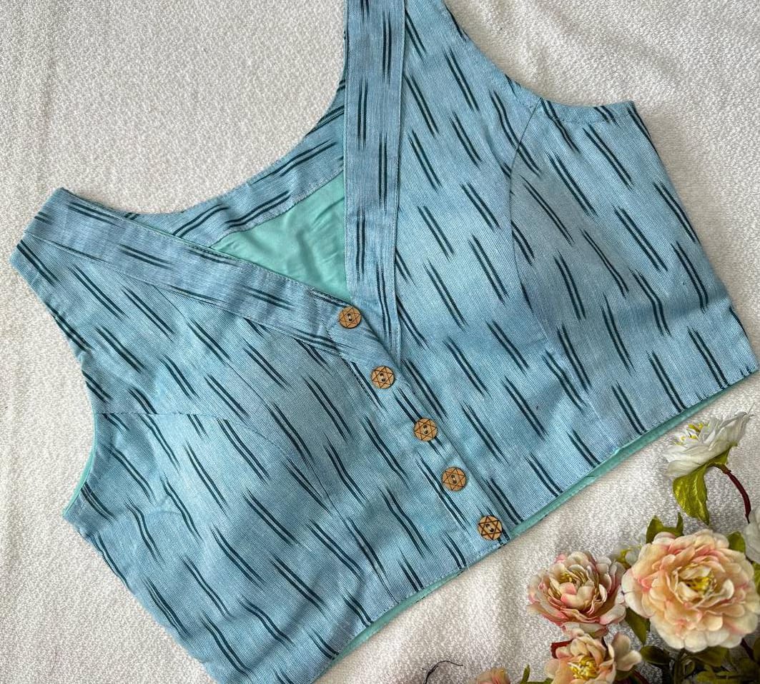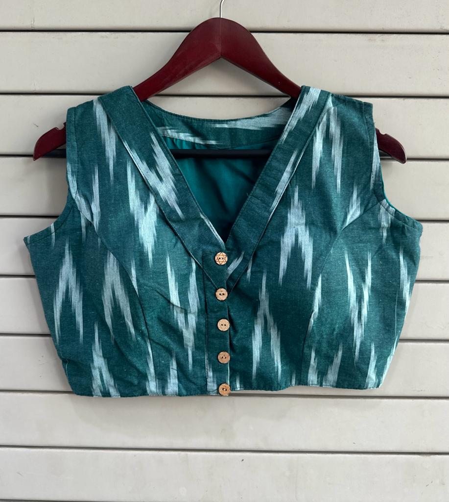 Step into sophistication with our Pure Ikkat Cotton Blouse, a testament to timeless style and comfort. The blouse boasts a height of 15 inches and comes with a 10-inch inside attached sleeve for a graceful silhouette. The V front collar pattern adds a touch of modern flair, while the front open design with hooks and fancy 5 buttons ensures easy wear. Enjoy a perfect fit with the included pads, and revel in the comfort of the cotton lining. Elevate your wardrobe with this blend of traditional charm and contemporary design