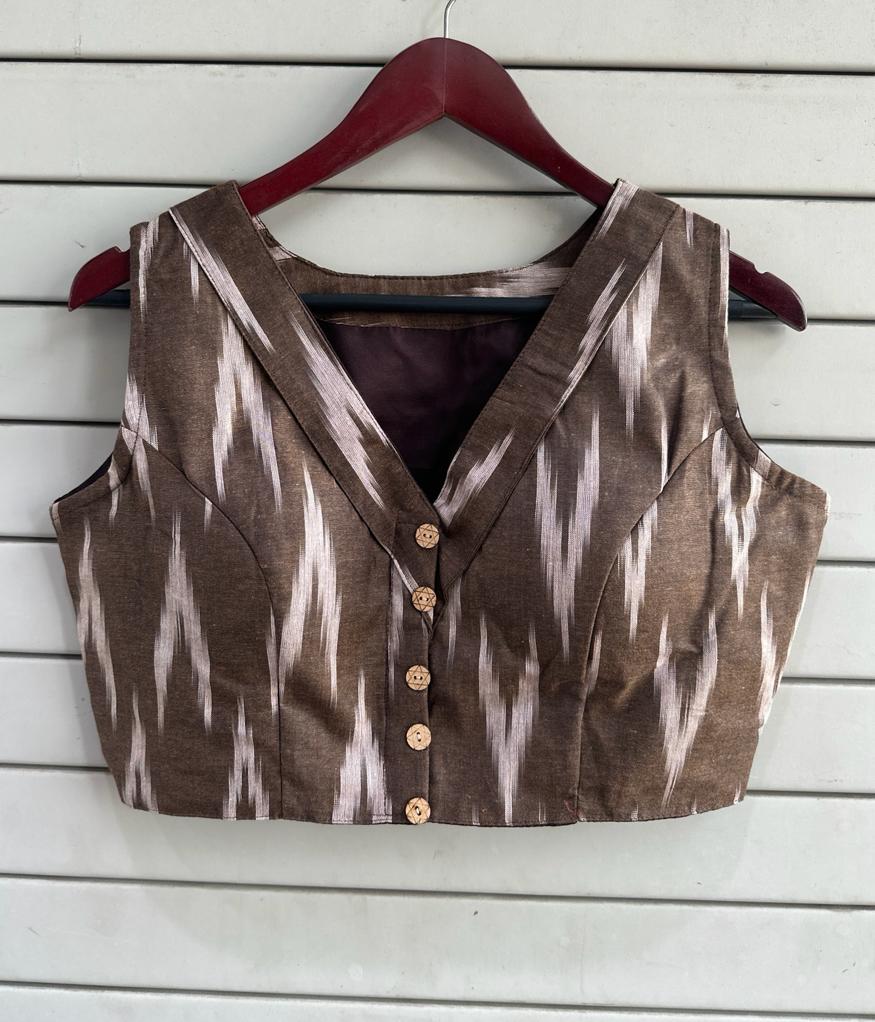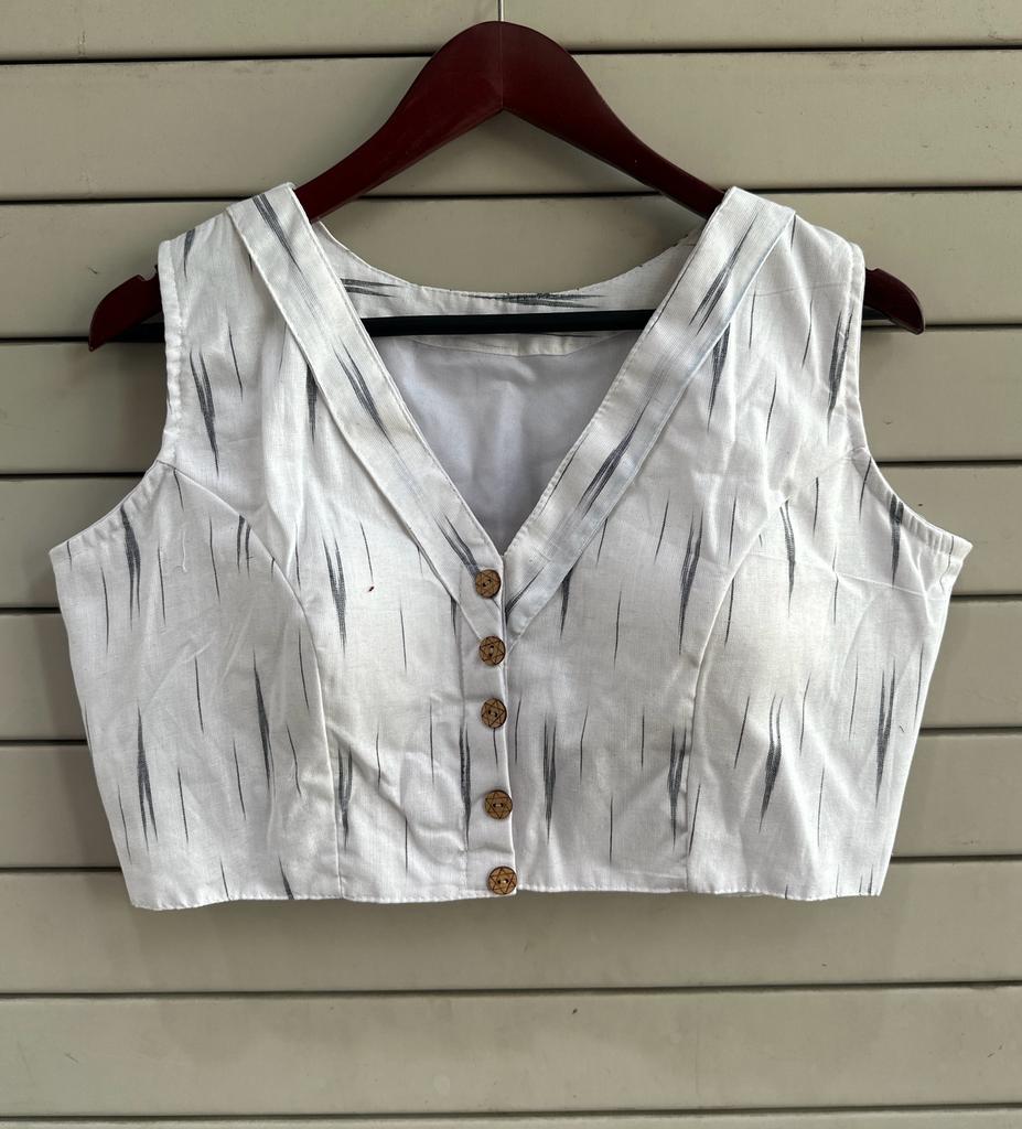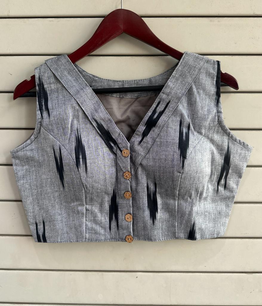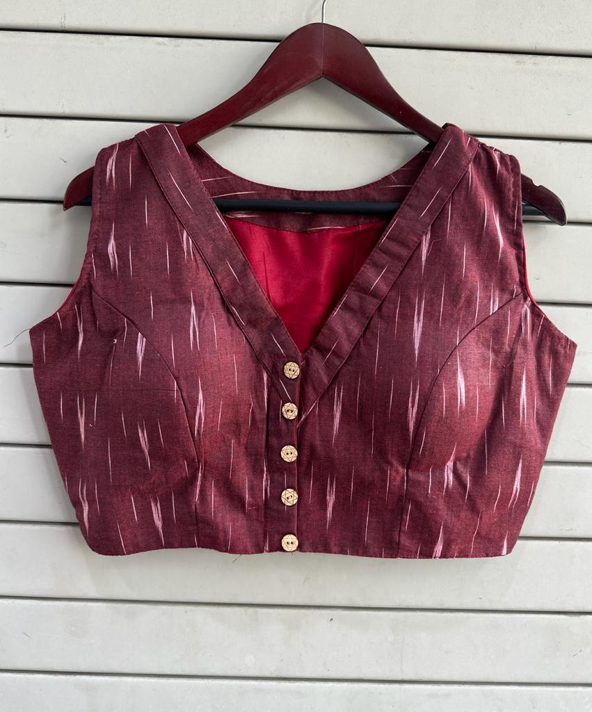 Step into sophistication with our Pure Ikkat Cotton Blouse, a testament to timeless style and comfort. The blouse boasts a height of 15 inches and comes with a 10-inch inside attached sleeve for a graceful silhouette. The V front collar pattern adds a touch of modern flair, while the front open design with hooks and fancy 5 buttons ensures easy wear. Enjoy a perfect fit with the included pads, and revel in the comfort of the cotton lining. Elevate your wardrobe with this blend of traditional charm and contemporary design