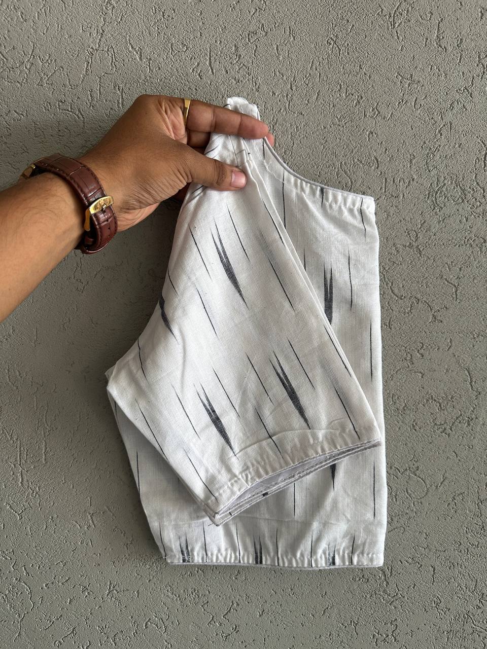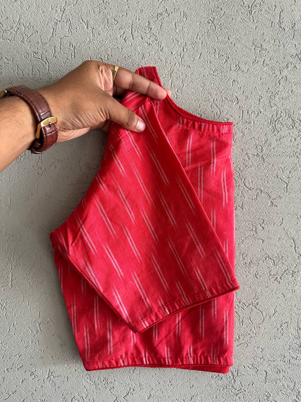 Pure Ikkat Handloom Cotton Blouse  Cotton BoatNeck Kam RoundNeck Blouse Length:- 15 Size:-32 to 42 Chest Size Making Size 38 Non Padded  Non Lining Hook front Open 55 Colours