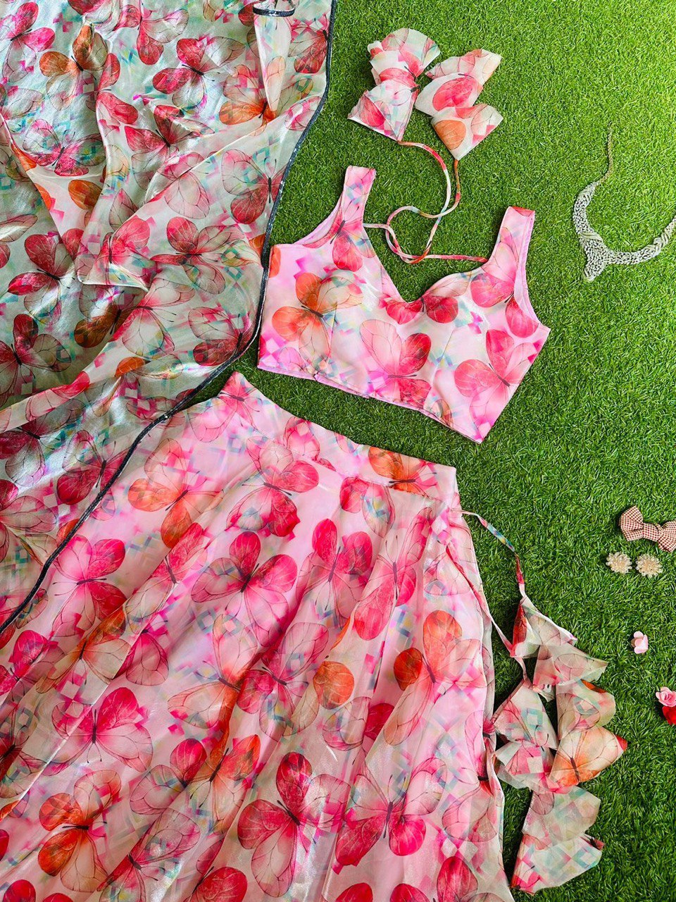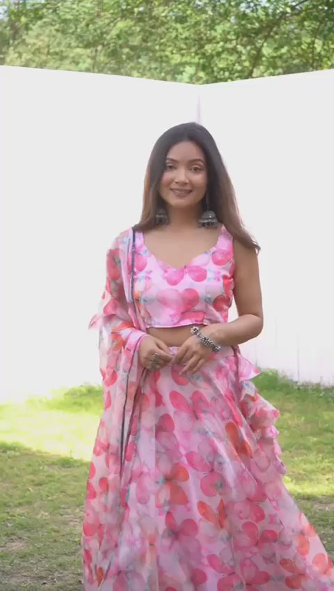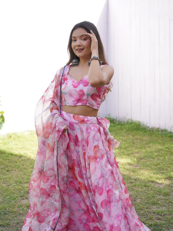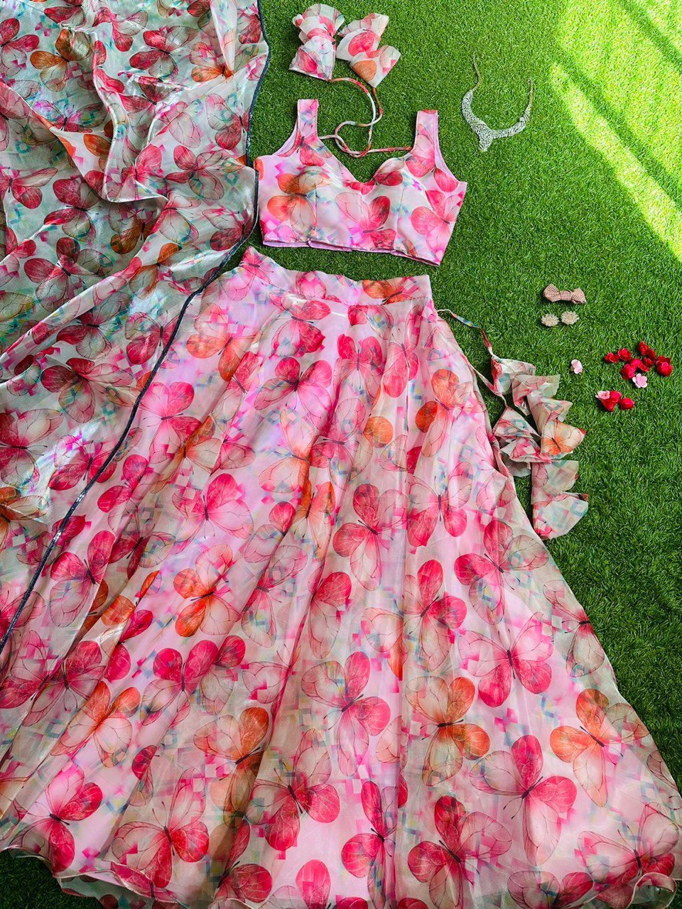 Step into the realm of timeless elegance with our Pure Jimmy Choo Organza Silk Digital Printed Lehenga ensemble. The ensemble is a symphony of opulence, featuring a meticulously crafted lehenga adorned with enchanting digital prints on pure Jimmy Choo organza silk. The lehenga boasts a voluminous flair enhanced by a canvas patta, ensuring a majestic presence. Paired with a fully stitched, size 38 padded blouse in luxurious Jimmy Choo fabric, this outfit exudes sophistication. The look is completed with an ethereal organza dupatta adorned with a delicate lace border, adding a touch of grace to this divine creation. This ensemble is a masterpiece of sartorial artistry, promising to make you the epitome of grace and glamour at any grand occasion.