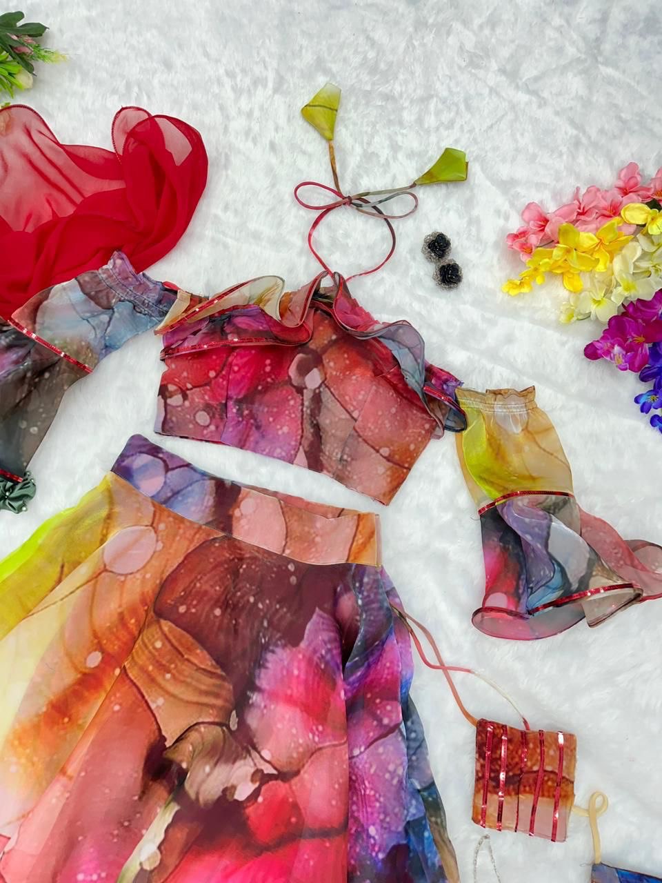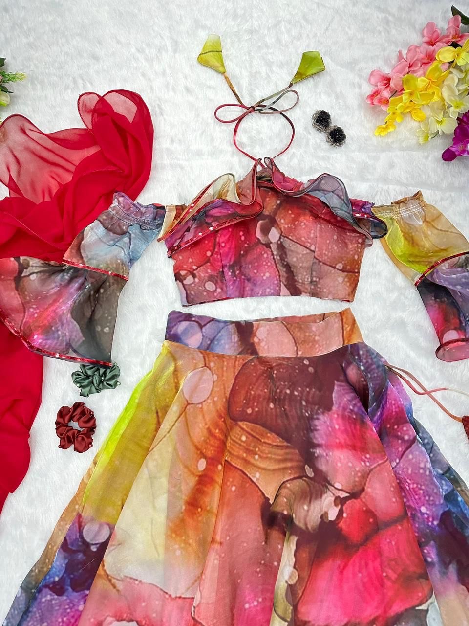 Adorn yourself in opulence with the Pure Jimmy Choo Organza Silk Digital Printed Lehenga ensemble. The fully stitched blouse, made from pure Jimmy Choo fabric, features metallic CD lace detailing and is designed for a perfect fit in size 38, with a generous margin given up to size 42 for added comfort. The lehenga takes center stage with its Pure Jimmy Choo Organza Silk Digital Printed design, showcasing a huge flair and enhanced by a canvas patta for a touch of grandeur. Completing the ensemble is a cascade pattern Dupatta made of Georgette, adding a graceful finishing touch to this luxurious outfit. This Pure Jimmy Choo Organza Silk Digital Printed Lehenga is a celebration of refined taste and contemporary allure, making a statement at any special occasion.