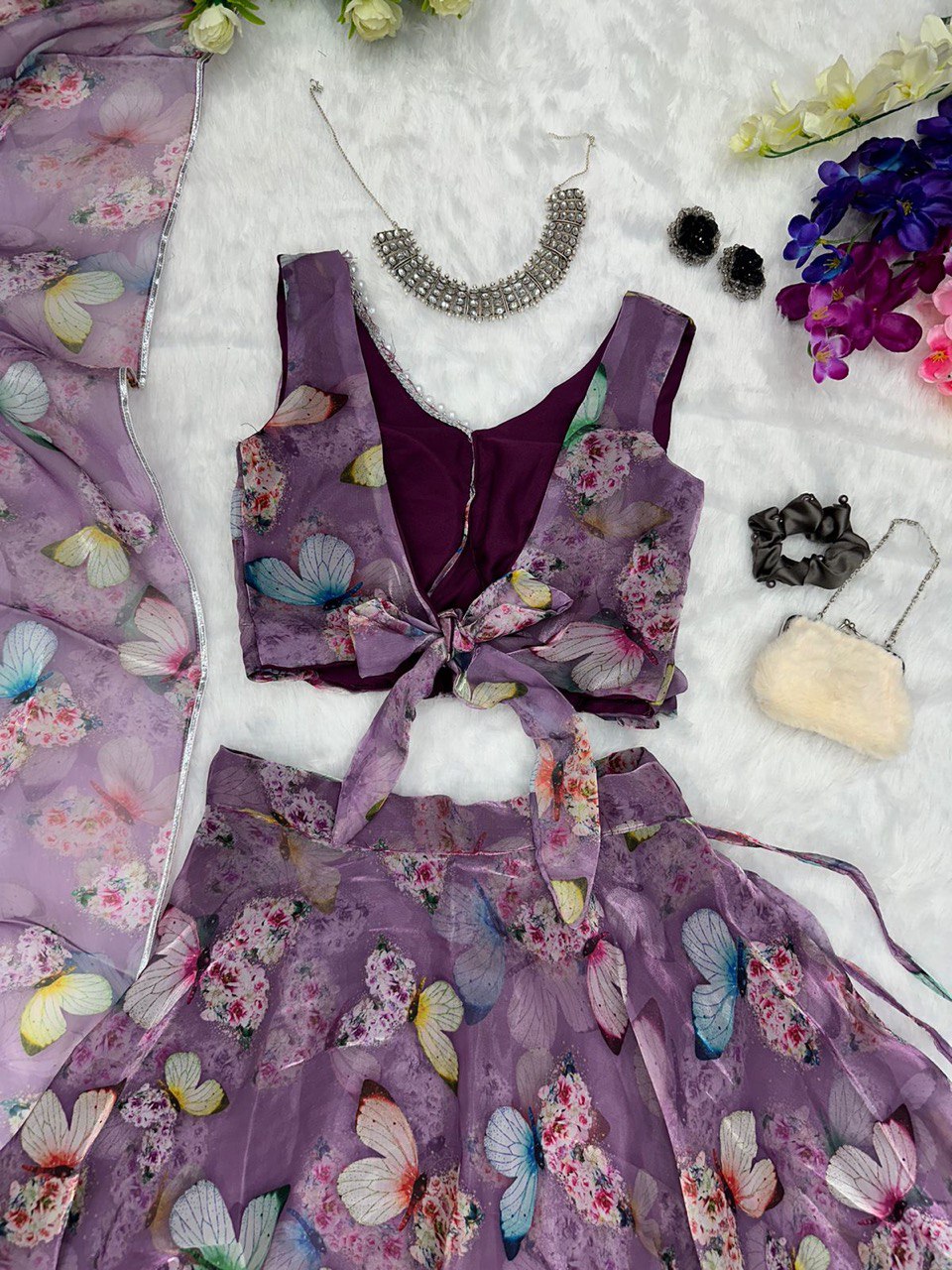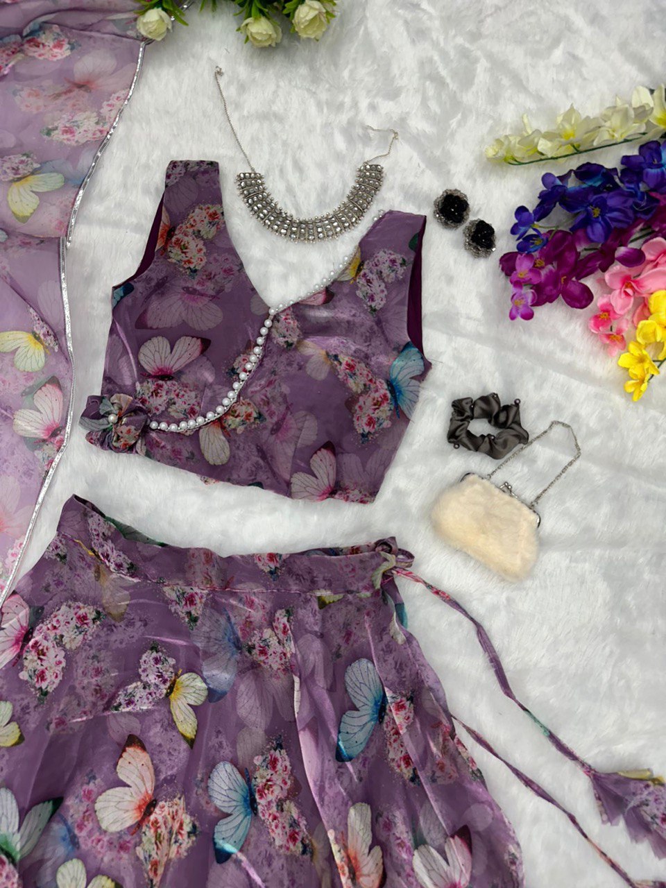 Elevate your style with the Pure Jimmy Choo Organza Silk Digital Printed Lehenga ensemble. The fully stitched blouse, made from pure Jimmy Choo fabric, boasts a designer lace and handcrafted flower detailing for an exquisite touch. Crafted for a perfect fit in size 38, the padded blouse comes with a generous margin provided up to size 42 for added comfort. The lehenga commands attention with captivating digital prints on Pure Jimmy Choo Organza Silk, featuring a huge flair and enhanced by a canvas patta. Completing the ensemble is a Jimmy Choo Organza Dupatta, adding a touch of grace to this opulent and refined outfit. This Pure Jimmy Choo Organza Silk Digital Printed Lehenga is a celebration of sophistication, making a statement at any special occasion with its luxurious design and timeless allure.