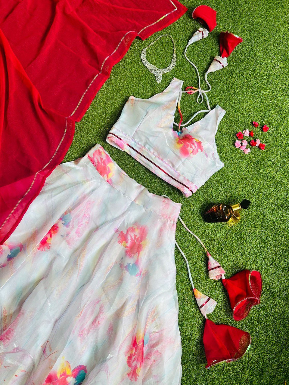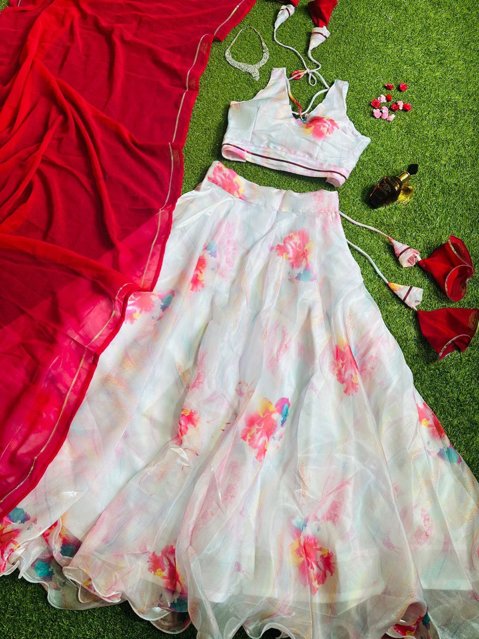 Elevate your style with the opulent Pure Jimmy Choo Organza Silk Digital Printed Lehenga ensemble. The fully stitched blouse, made from pure Jimmy Choo fabric, is adorned with metallic CD lace detailing and is designed for a flawless fit in size 38 with a generous margin provided till 42 for added comfort. The lehenga commands attention with captivating digital prints on Pure Jimmy Choo Organza Silk, featuring a magnificent flair and enhanced by a canvas patta for added grandeur. Completing the ensemble is a georgette dupatta with a delicate lace border, adding a touch of grace and sophistication. This Pure Jimmy Choo Organza Silk Digital Printed Lehenga is a celebration of luxury and contemporary allure, ready to make a statement at any special occasion.