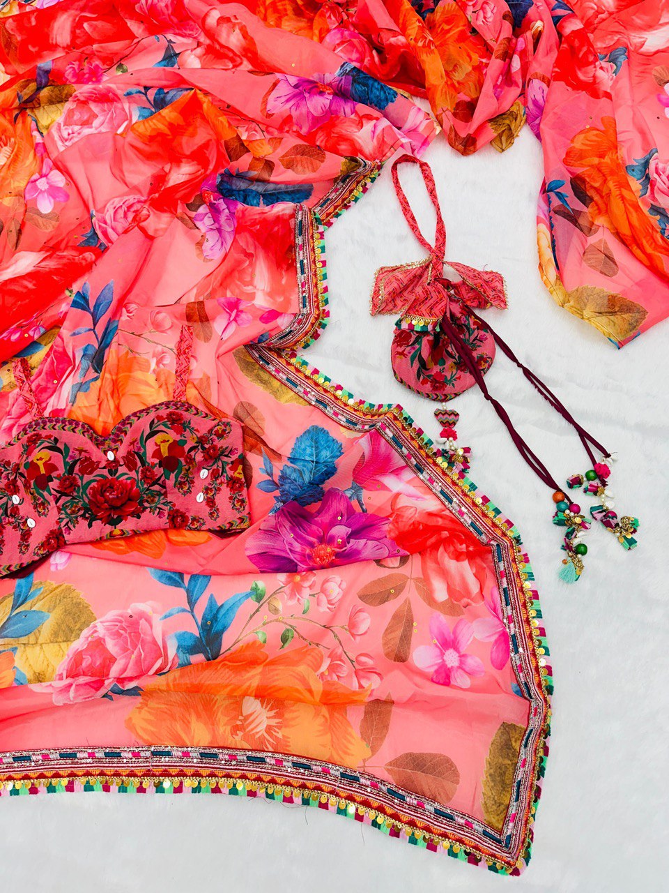 With Ri8 Fashion Every women would be *FLAME You gonna love elegance with Modern touch Sara ali khan *Saree* - Pure Jimmy Organza Digital Printed saree with sequence + Embroidery Sequins work lace border *Blouse* - jimmy organza digital printed with sleeves fabric Unstitch blouse *Batwa bag : given same as shown* *same as shown in video*