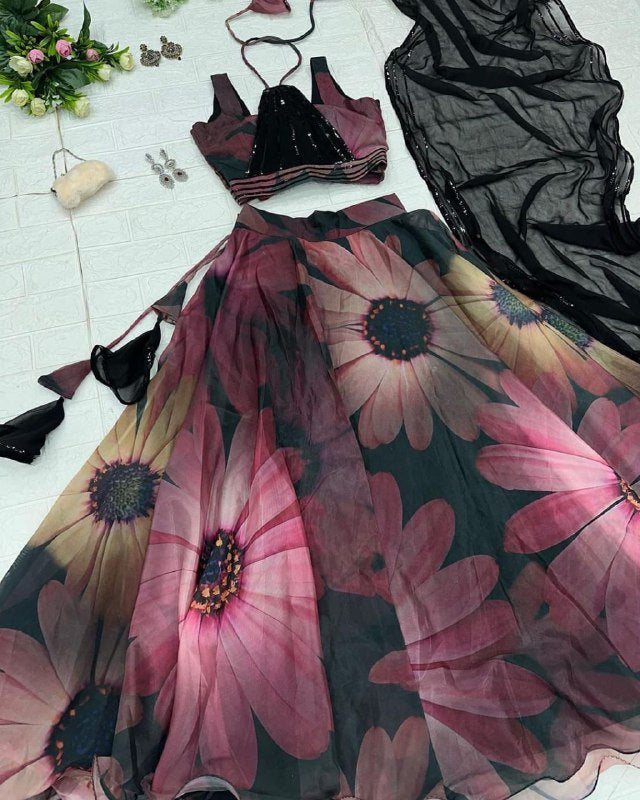 Elevate your style with our Pure Jimmy Organza Silk Digital Printed Lehenga ensemble that promises to make heads turn at every twirl. The fully stitched Blouse, a fusion of pure Jimmy Organza Silk and Georgette fabric, boasts a metallic strip for that extra touch of glamour. Designed in size 38 with padding and a given margin, it ensures a comfortable and perfect fit for your festivities. The Lehenga steals the show with its dazzling digital print on Pure Jimmy Organza Silk, featuring an 8-meter flair and a canvas patta for that added festive bounce. Complete your look with the Georgette Dupatta, adorned with love and a metallic sequins border on all four sides. This ensemble is not just clothing; it's an expression of pure elegance, ready to make you shine in every celebration. Get ready to embrace the allure of Pure Jimmy Organza Silk and step into the limelight with confidence!