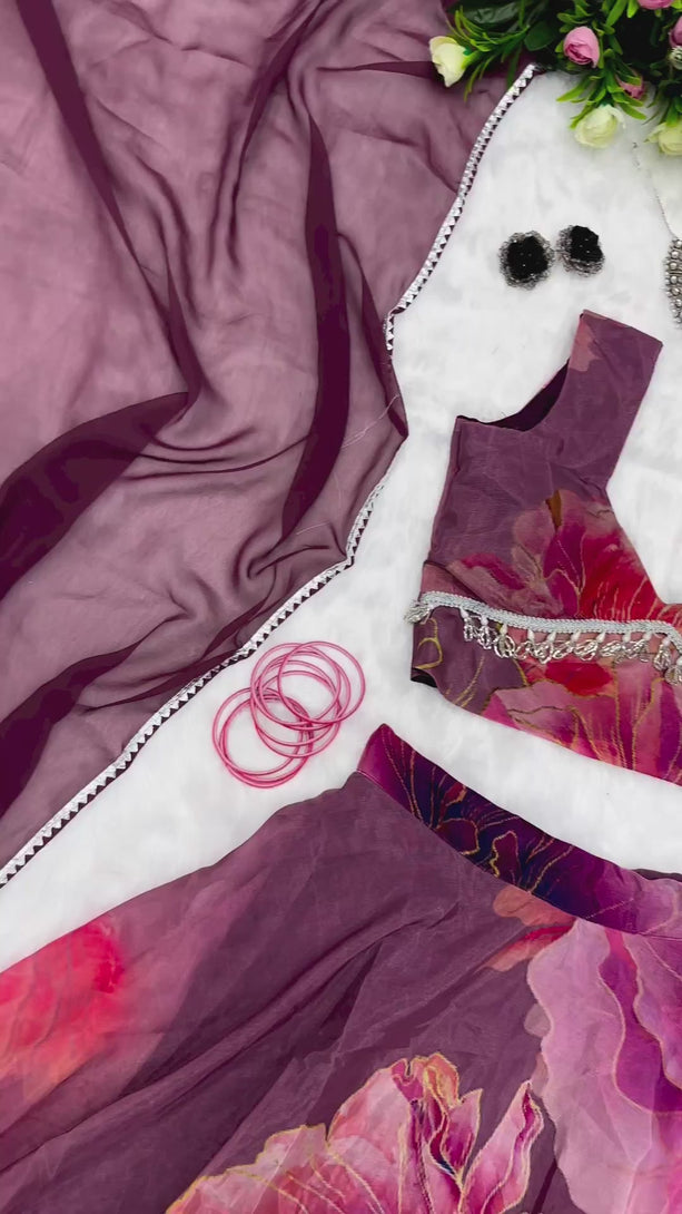 Step into refined elegance with the Pure Jimmy Organza Silk Digital Printed Lehenga ensemble. The fully stitched set features a size 38 padded blouse crafted from pure Jimmy organza silk, adorned with handwork lace and a thoughtful margin for comfort. The lehenga takes center stage, boasting captivating digital prints on pure Jimmy organza silk, an impressive 8-meter flair, and enhanced by a canvas patta for added opulence. Completing the ensemble is a 2-meter Jimmy Organza dupatta with a lace border, adding a touch of grace. This Lehenga invites you to effortlessly embody sophistication and make a memorable statement at any special occasion. It is a fusion of timeless charm and contemporary allure, promising a captivating presence.