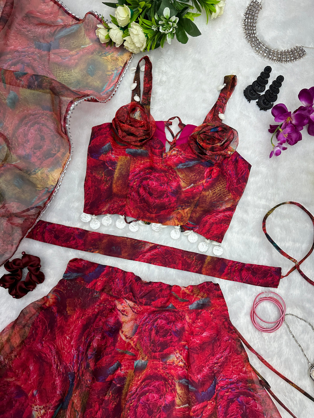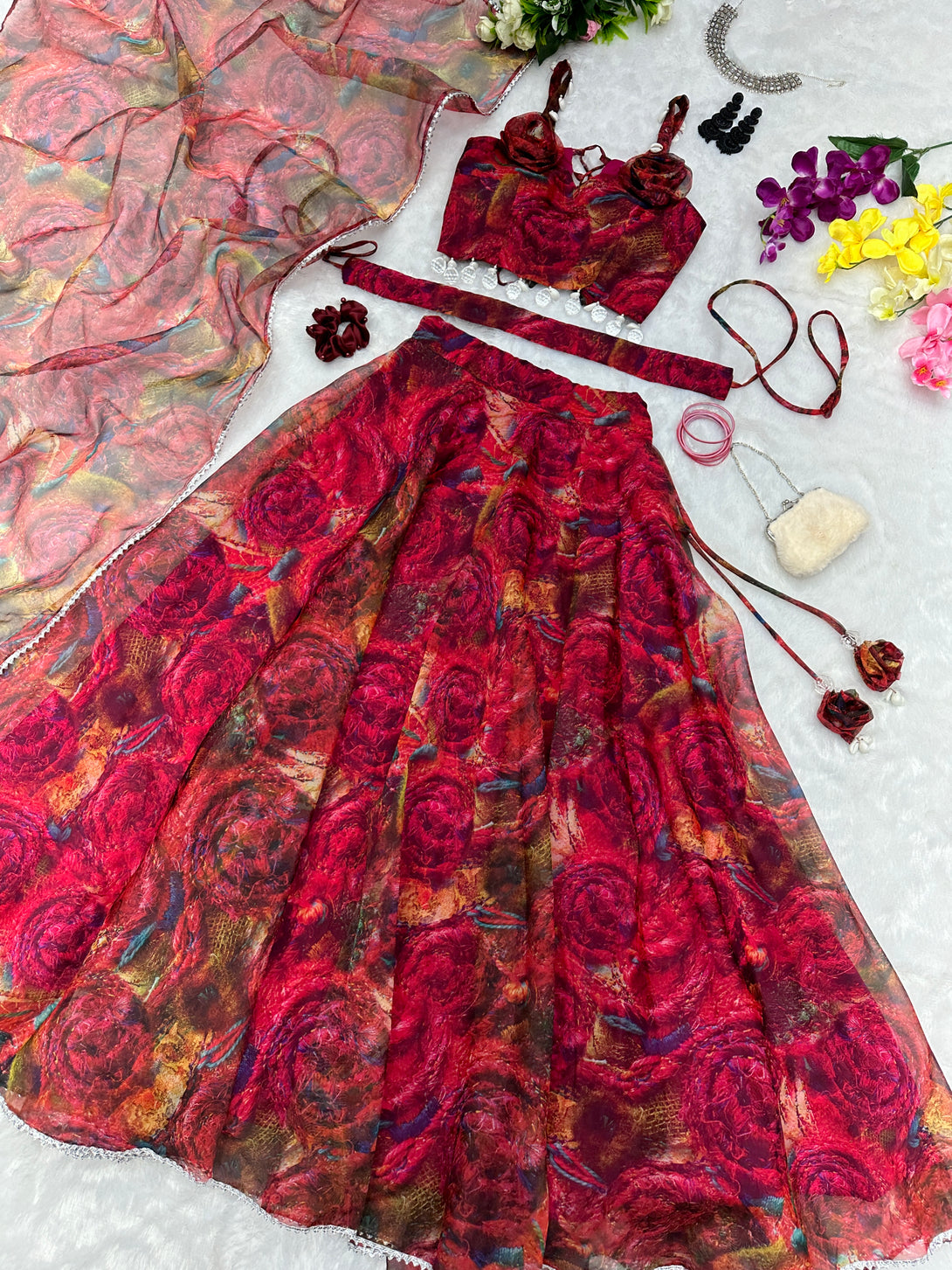 Elevate your elegance with our Pure Organza Silk Digital Printed Lehenga. The fully stitched blouse, tailored from pure silk organza, features handcrafted kodi work and designer tassels, ensuring a perfect fit for sizes 38 with an extended margin up to 42. The lehenga dazzles with a digital print on pure organza silk, boasting an impressive 8-meter flair and canvas patta. Complete your ensemble with the organza dupatta adorned with a delicate lace border, adding a touch of grace to your attire.