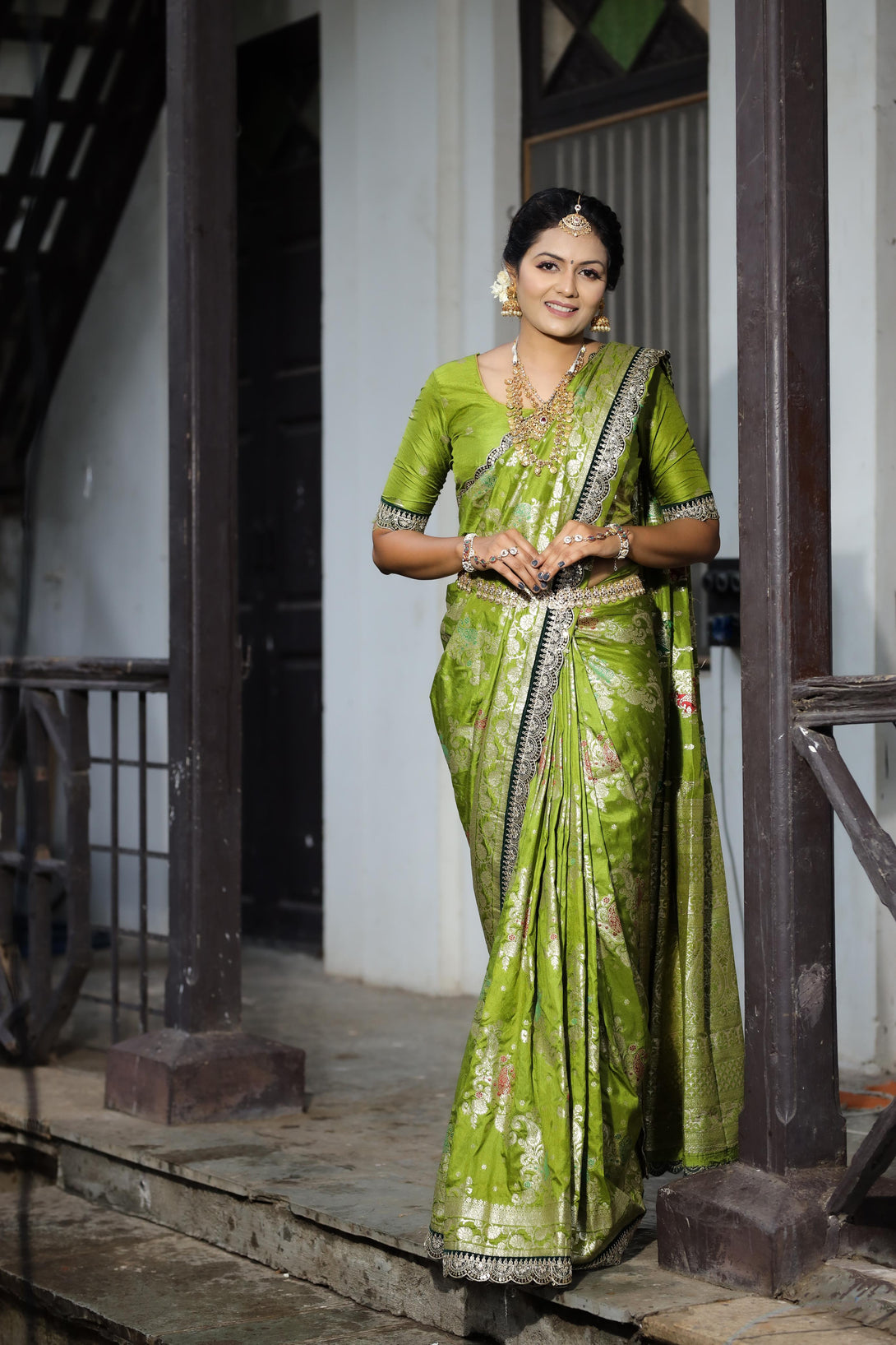 Work: Features heavy multi-stitched embroidery with an ornate border, seamlessly integrated with the saree and blouse.