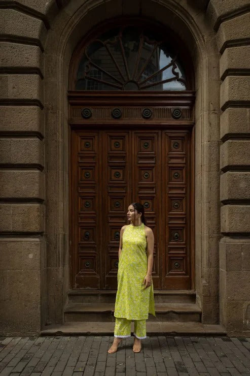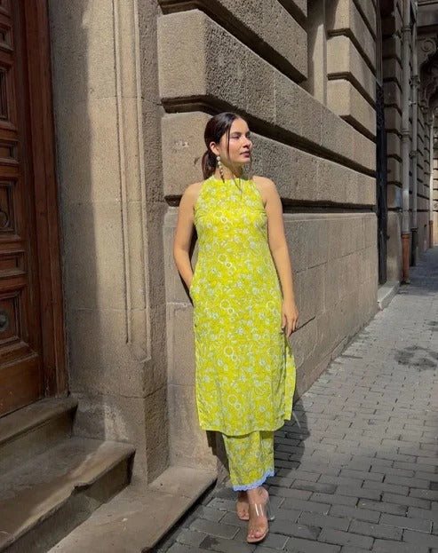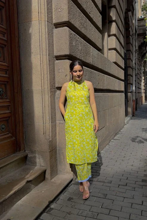 Sufi co-ord set in lemon yellow with sanganeri hand block floral prints with halter neck, both kurta and pants come with pockets. Kurta has slits on the sides. The fabric used is a very fine quality cotton directly sourced from the artisans of Sanganer. The kurta pant set can be paired with white Kota chikankari dupatta.